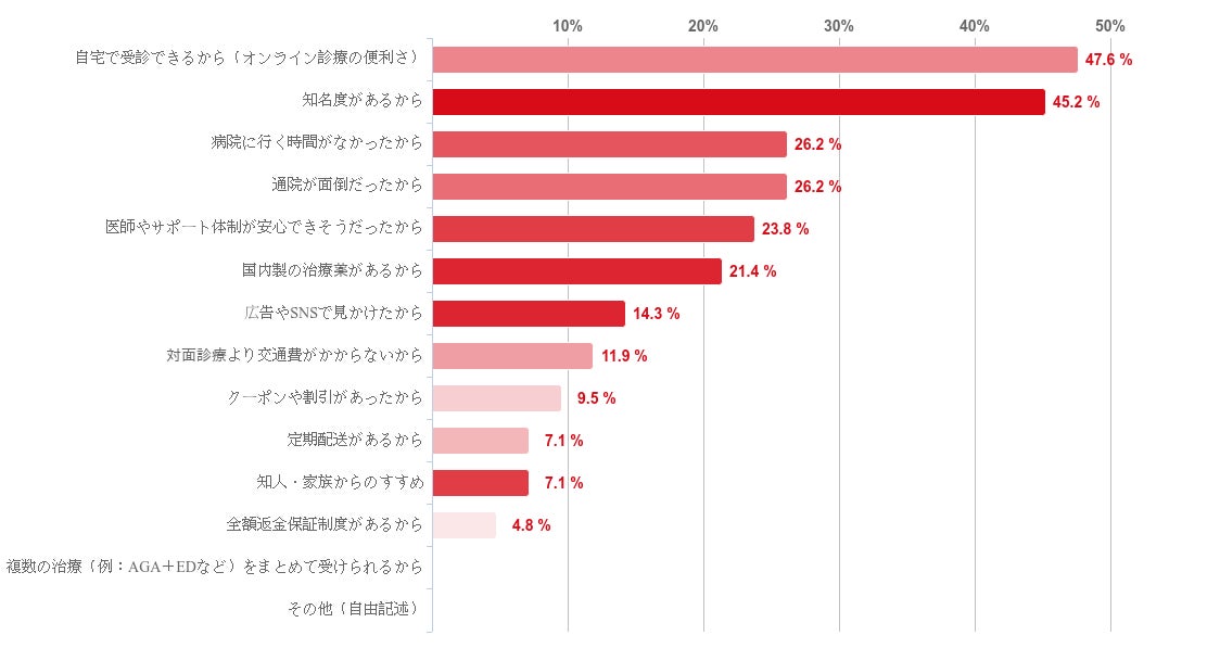 「自宅で受診できるから(オンライン診療の便利さ)」と回答した人が47.6%で最も多く、次いで「知名度があるから」が45.2%、「病院に行く時間がなかったから」と「通院が面倒だったから」が同率で26.2%という順になった。