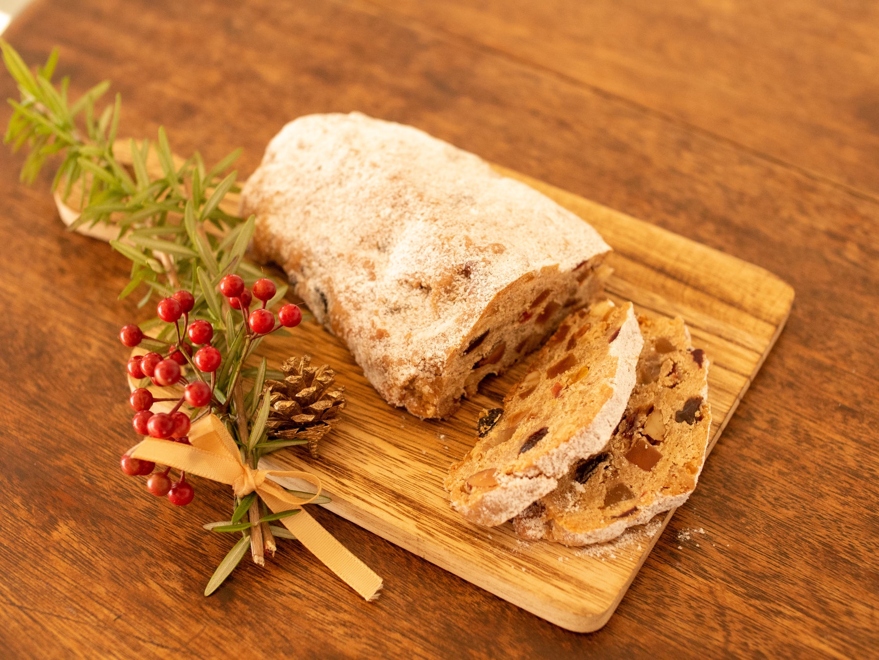 国産小麦を薪火で発酵させ、EM菌でふっくら仕上げた特製シュトレン。洋酒漬け果実とナッツが織りなす深い熟成の味わいをお届けします。