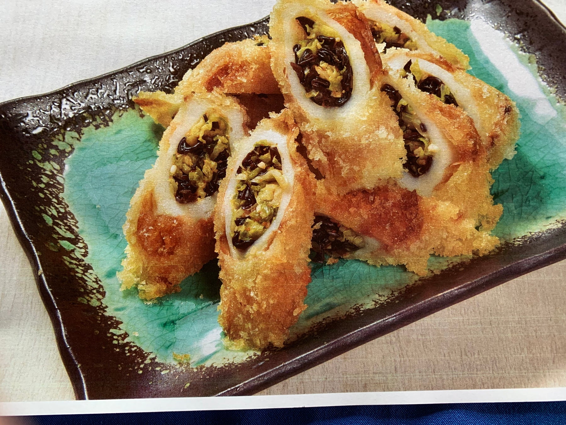 きくらげとキャベツを千切りにして炒め、にんにくと唐辛子のパンチの効いた味。それをちくわの芯に詰めパン粉をまとわせました。