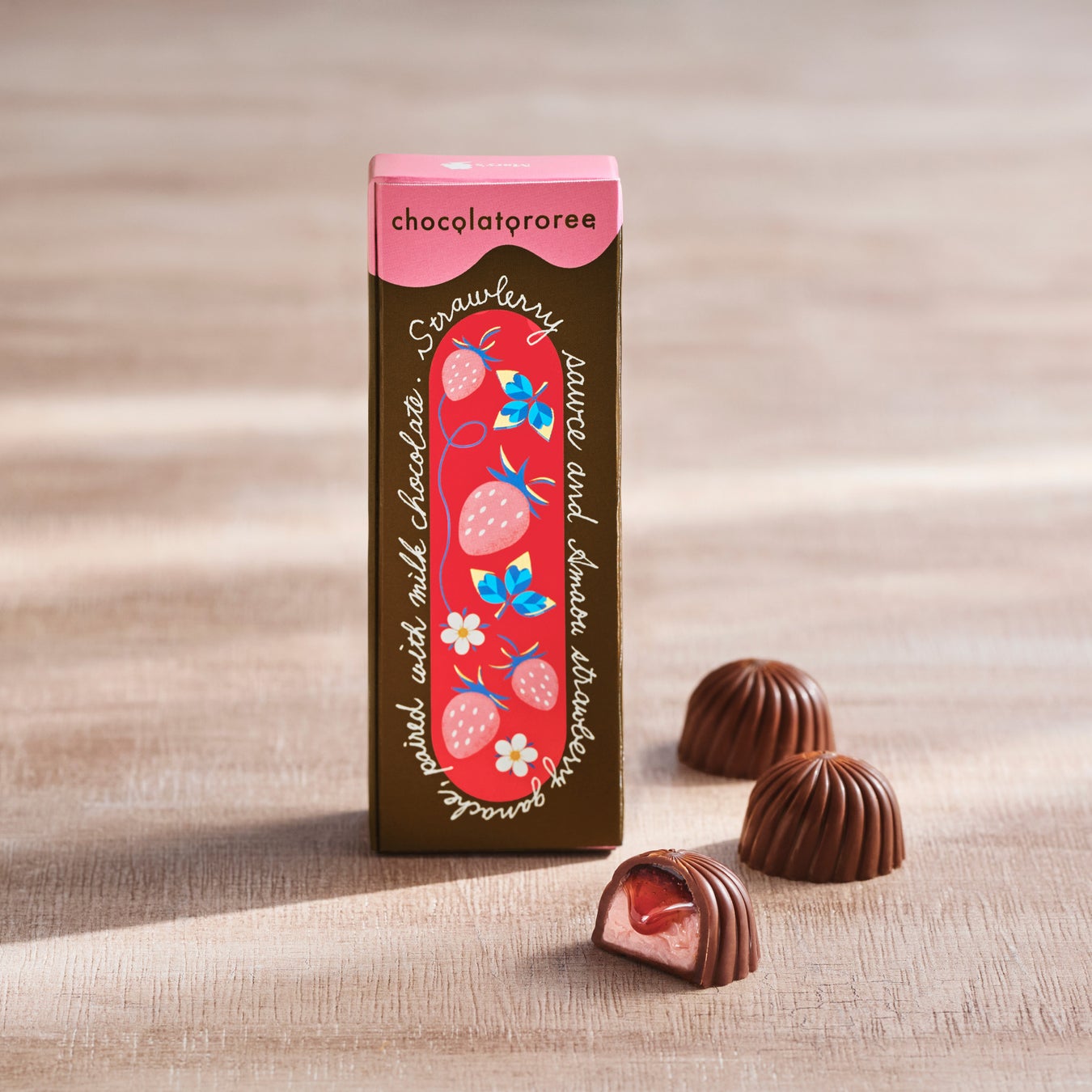ジューシーな福岡県産あまおう苺ガナッシュに、甘酸っぱいストロベリーソースがアクセント。メリー自慢のコク深いミルクチョコレートで包みました。