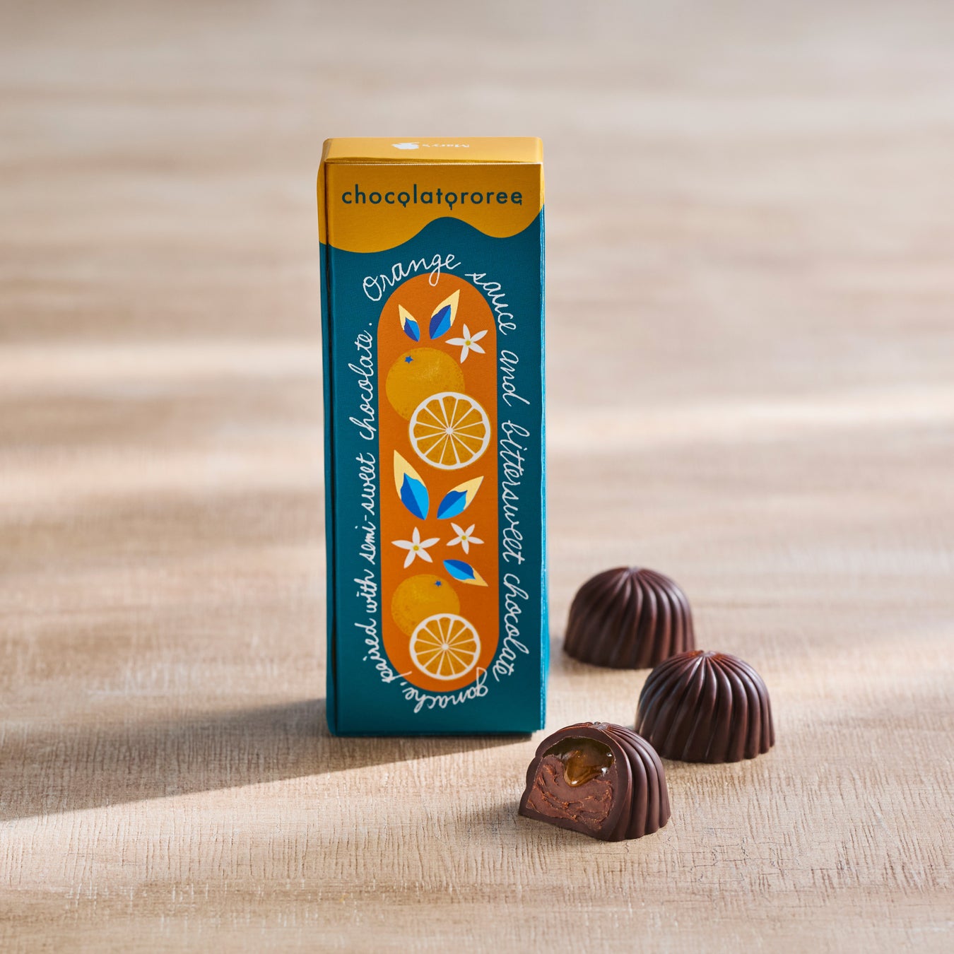 ほろ苦いオレンジソースが引き立てる、ビターな味わいのスイートチョコレートガナッシュ。香り付けにコアントローを使用し、上品で華やかな味わいに。