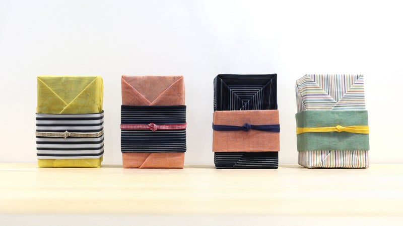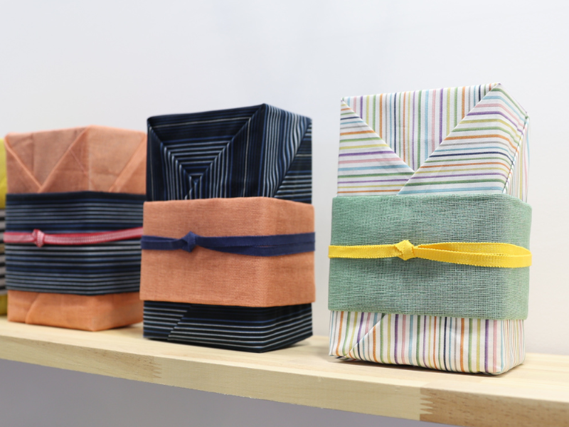 「小倉 縞縞(KOKURA SHIMA SHIMA)」 の風呂敷をメインに使用したお包み 「縞づつみ」 を、