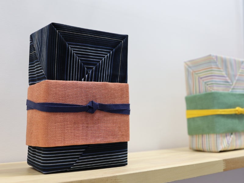 「小倉 縞縞(こくらしましま)」の風呂敷を用い、贈る方と贈られる方の「心を包む」手仕事を