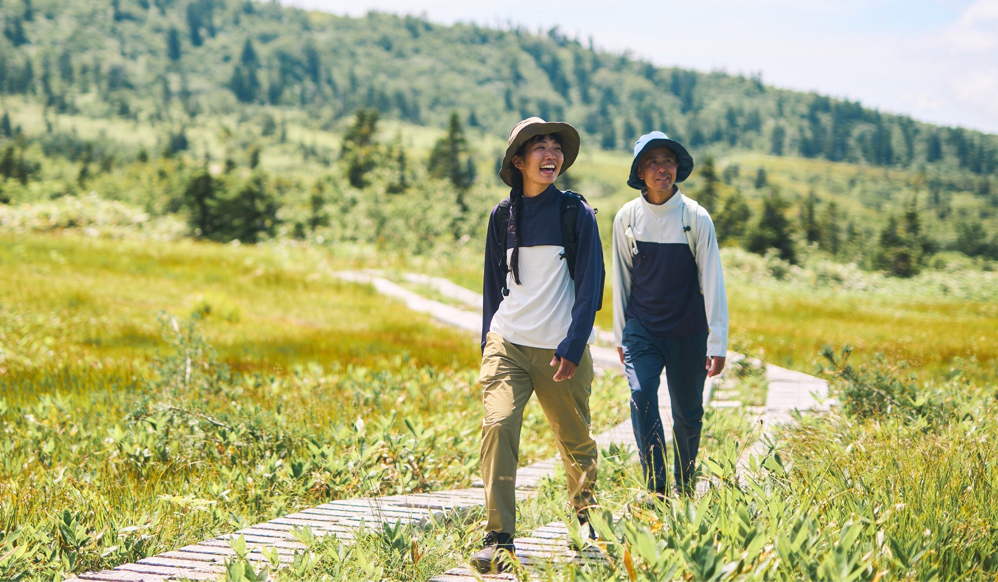 広いツバで顔まわりをしっかり覆うハイキングハット。頭周りのベンチレーションと吸汗素材のスベリで蒸れを抑え、春夏の登山やハイキングで快適に使用できます。