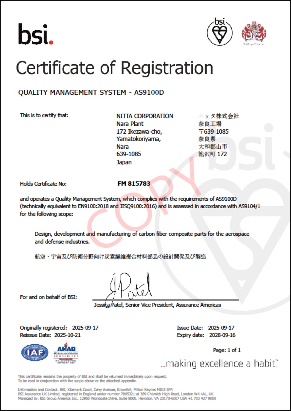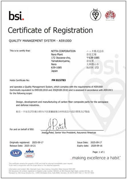 ニッタ株式会社(大阪府大阪市、代表取締役社長 北村精一)は、この度、CNT複合化技術Namd™を用いたCFRP製品において、航空宇宙品質マネジメント(AS9100)認証を取得しましたので、お知らせいたします。