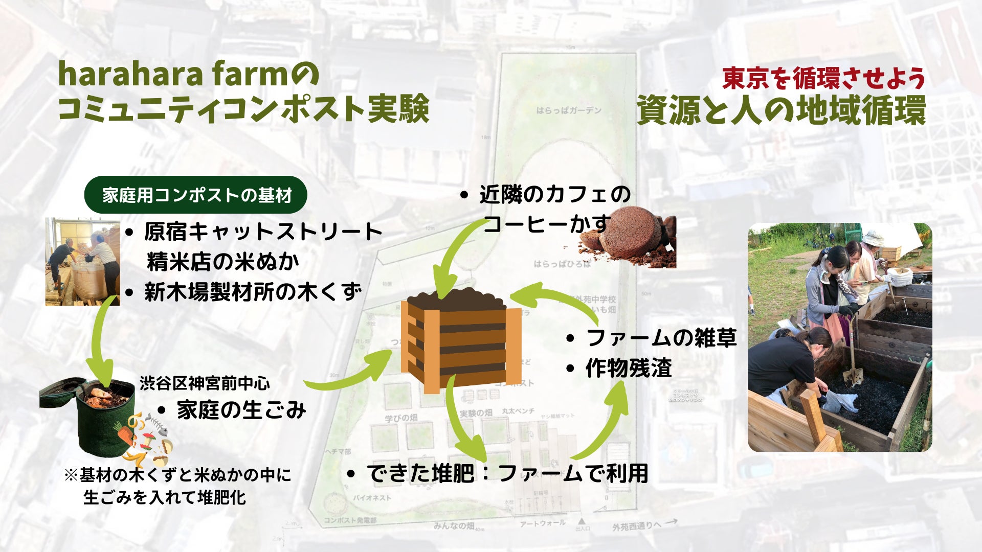 家庭の生ごみの他、ファームの雑草や作物残渣、原宿キャットストリートの精米店の米糠や新木場の製材所のおがくず、近隣の店舗から出るコーヒー豆かすなどをコミュニティコンポストで堆肥化し、畑の土に還しています。原宿はらっぱファームの「コンポスト部」参加者(40人以上)が工夫や知識を共有し、無理なく継続できる仕組みを育み、地域のつながりを広げています。