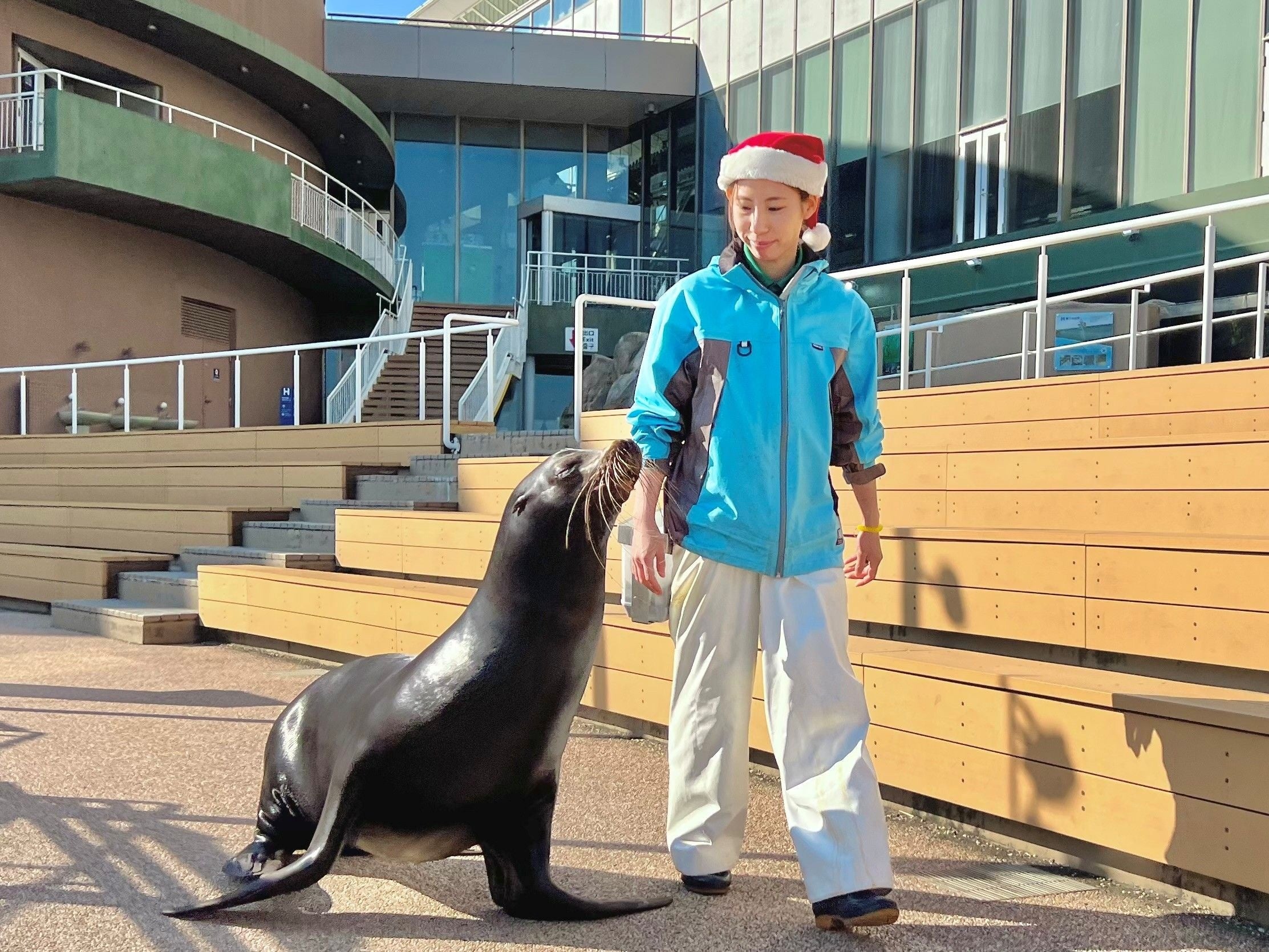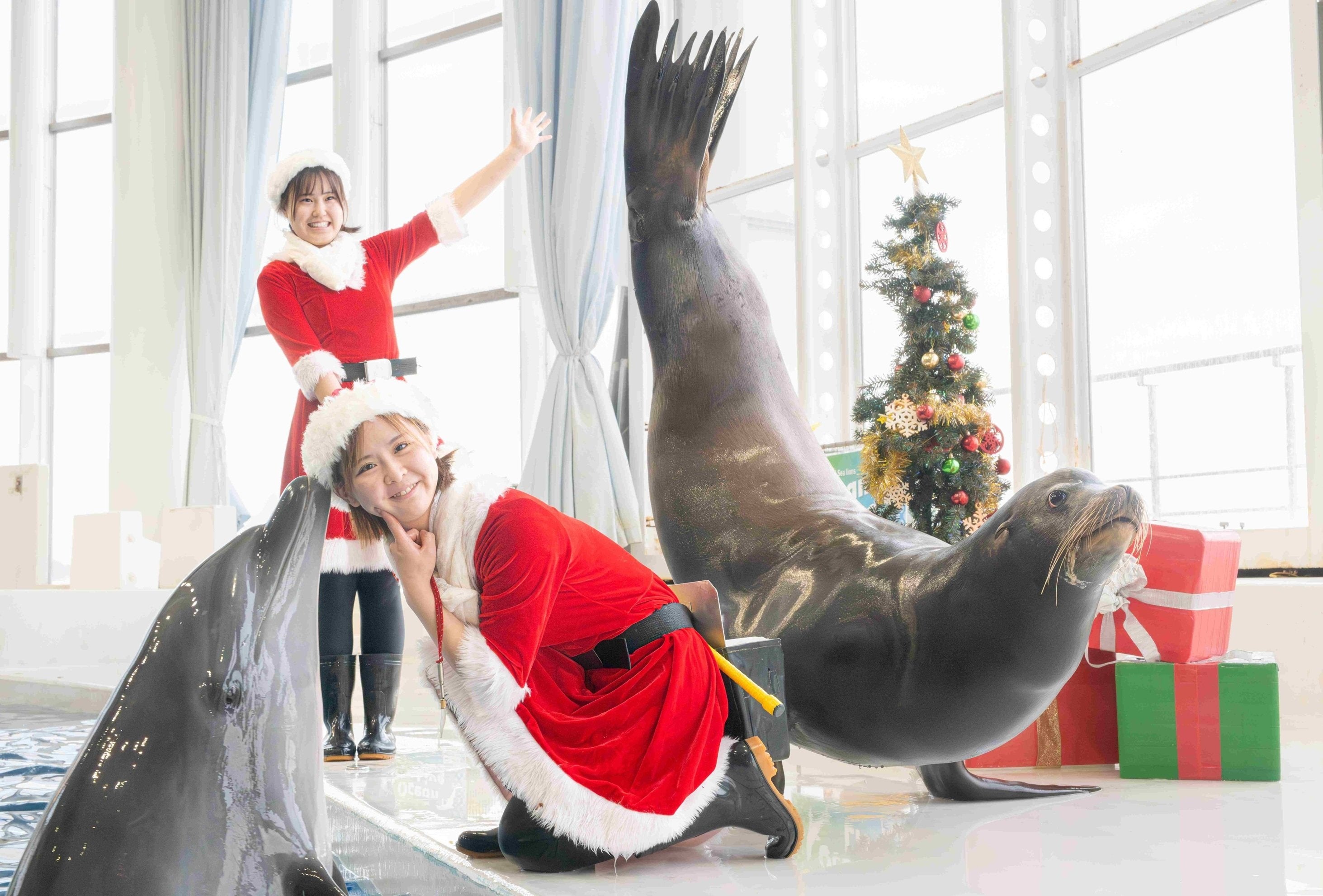 潮風が心地よい屋外エリア『オーシャンテラス』で毎日開催しているアシカのおさんぽタイムでは、サンタクロースに扮した飼育員とともに、クリスマスにちなんだパフォーマンスの数々を披露します。