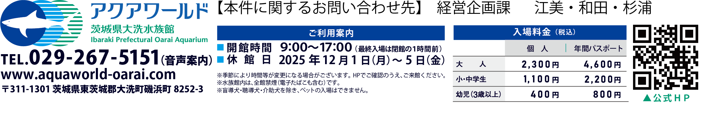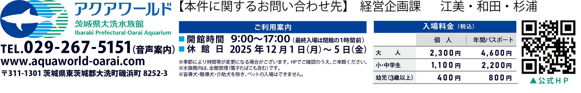 「サメの飼育種類数日本一」のアクアワールド茨城県大洗水族館(アクアワールド・大洗)では、“さぁ、新世海!”をタグラインに掲げ、様々な取り組みを行っております。このたび、アクアワールド・大洗ならではのクリスマスイベントを11月13日(木)から12月25日(木)まで開催いたします。ご多忙とは存じますが、取材方々よろしくお願いいたします。