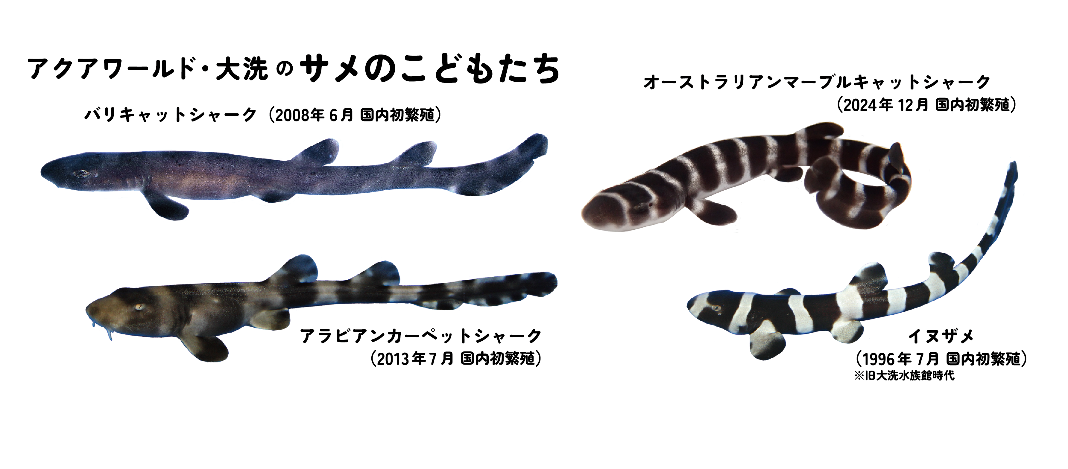 「クリスマス アクアワールド 2025」のメインを飾るのは、サメの飼育種類数日本一のアクアワールド・大洗ならではの「クリスマス水槽」です。「クリスマス水槽」は、「はじめてのクリスマス」をテーマに、今年当館で誕生し、はじめてクリスマスを迎える4種類のかわいらしいサメのこどもたちと、「サンタエビ」とも呼ばれるサンタクロースカラーが特徴のシロボシアカモエビを展示します。今回展示するサメのこどもたちは、すべて当館が日本で初めて繁殖に成功した種類です。特に、昨年12月に繁殖に成功した「オーストラリアンマーブルキャットシャーク」のこどもを見ることができるのは、国内ではアクアワールド・大洗だけです。