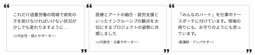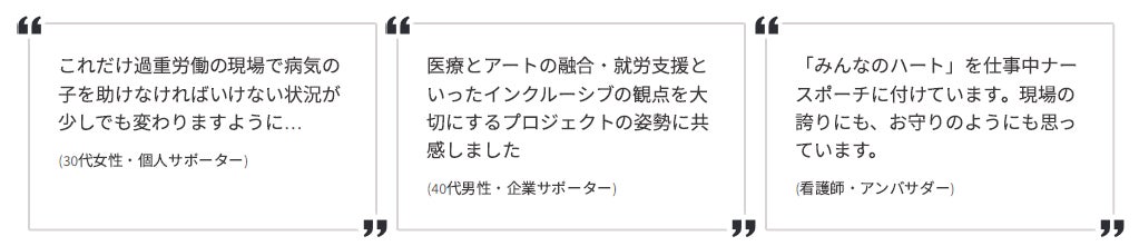 「医療とアートの融合・就労支援といったインクルーシブの観点を大切にするプロジェクトの姿勢に共感しました」(40代男性・企業サポーター)
