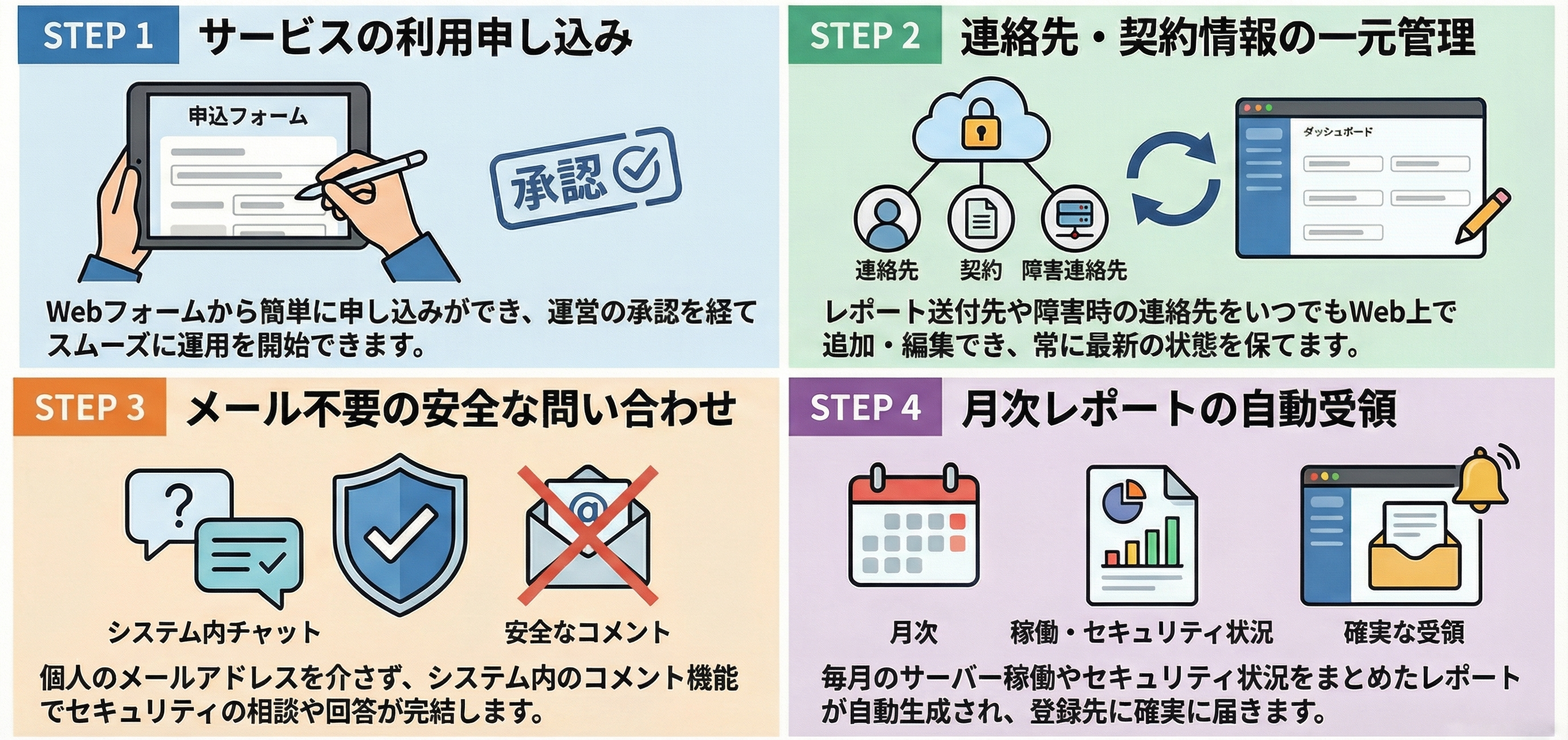 本システムは、SSS(サーバーセキュリティサービス)をご契約中のお客様を対象とし、月次レポートの受領、セキュリティに関するお問い合わせ、各種通知先情報の管理を一元的に行えるWebサービスです。
