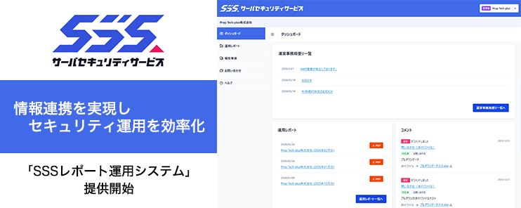 Prop Tech plus株式会社(本社:東京都千代田区、代表取締役社長:土井 敏宏)は、SSS(サーバセキュリティサービス)をご利用いただいているお客様に対して、月次レポートの受領、セキュリティに関するお問い合わせ、各種通知先情報の管理を一元的に行えるWebサービス「SSSレポート運用システム」の提供を開始しました。