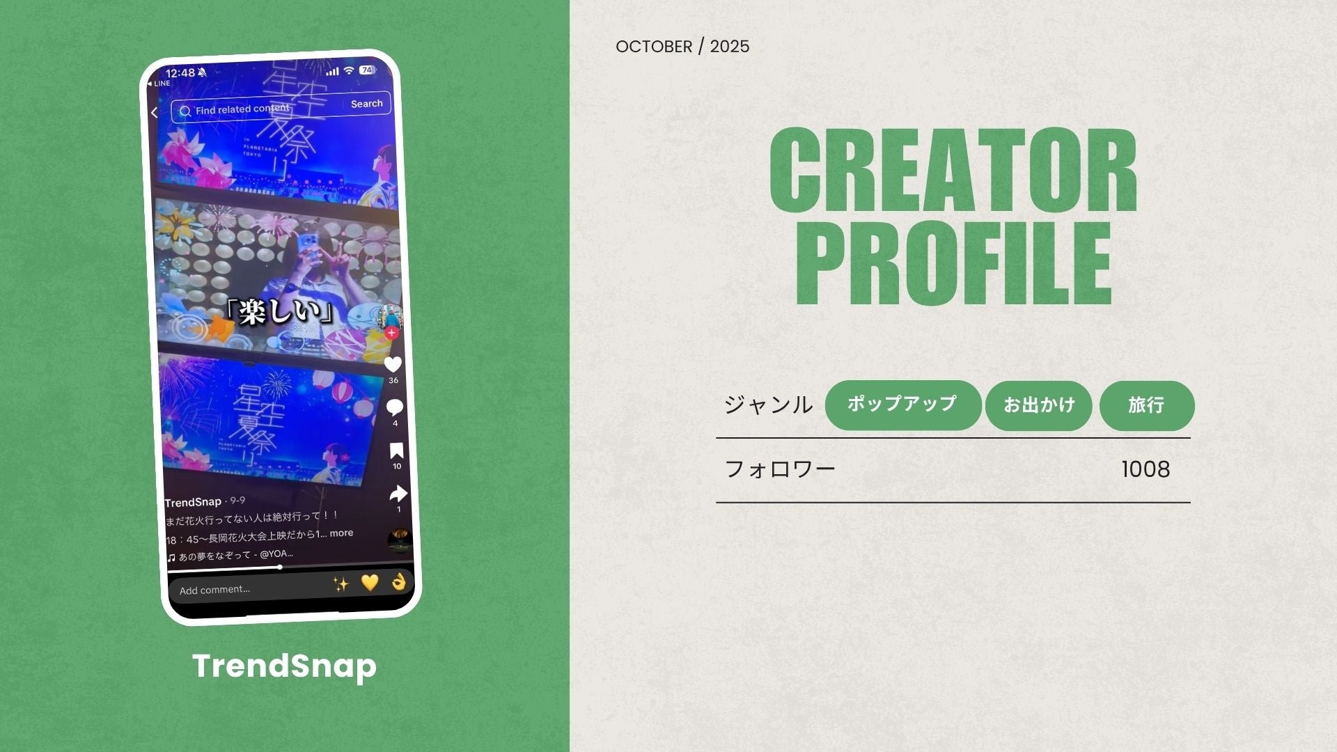 株式会社ベクトル(本社:東京都港区、代表取締役会長兼社長CEO:西江 肇司、東証プライム:6058、以下「ベクトル」)は、取材から配信までを行う独自のショート動画メディアネットワーク「ショート動画取材班」に、人気クリエイター「TrendSnap」が新たに加盟したことをお知らせいたします。