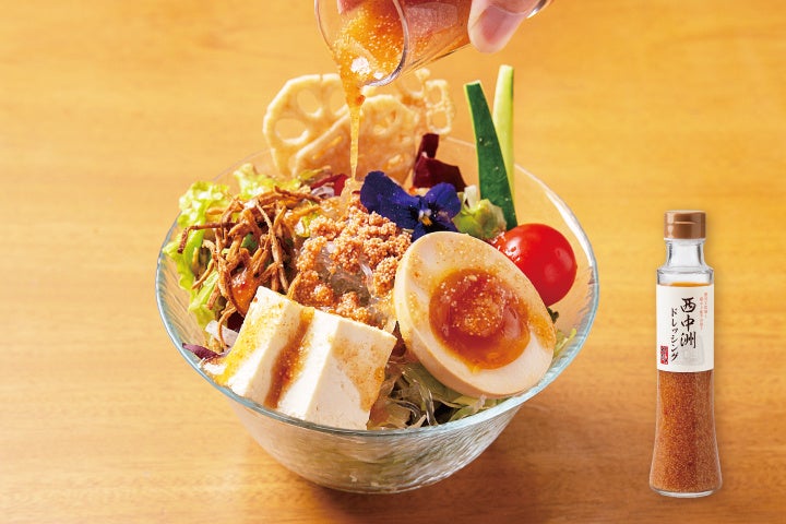 「西中洲ドレッシング」は明太子の粒感が特徴。サラダや豆腐など、いつもの料理にサッとかけるだけで食卓を華やかに演出するので、忙しい年末年始にも助かる一品です。