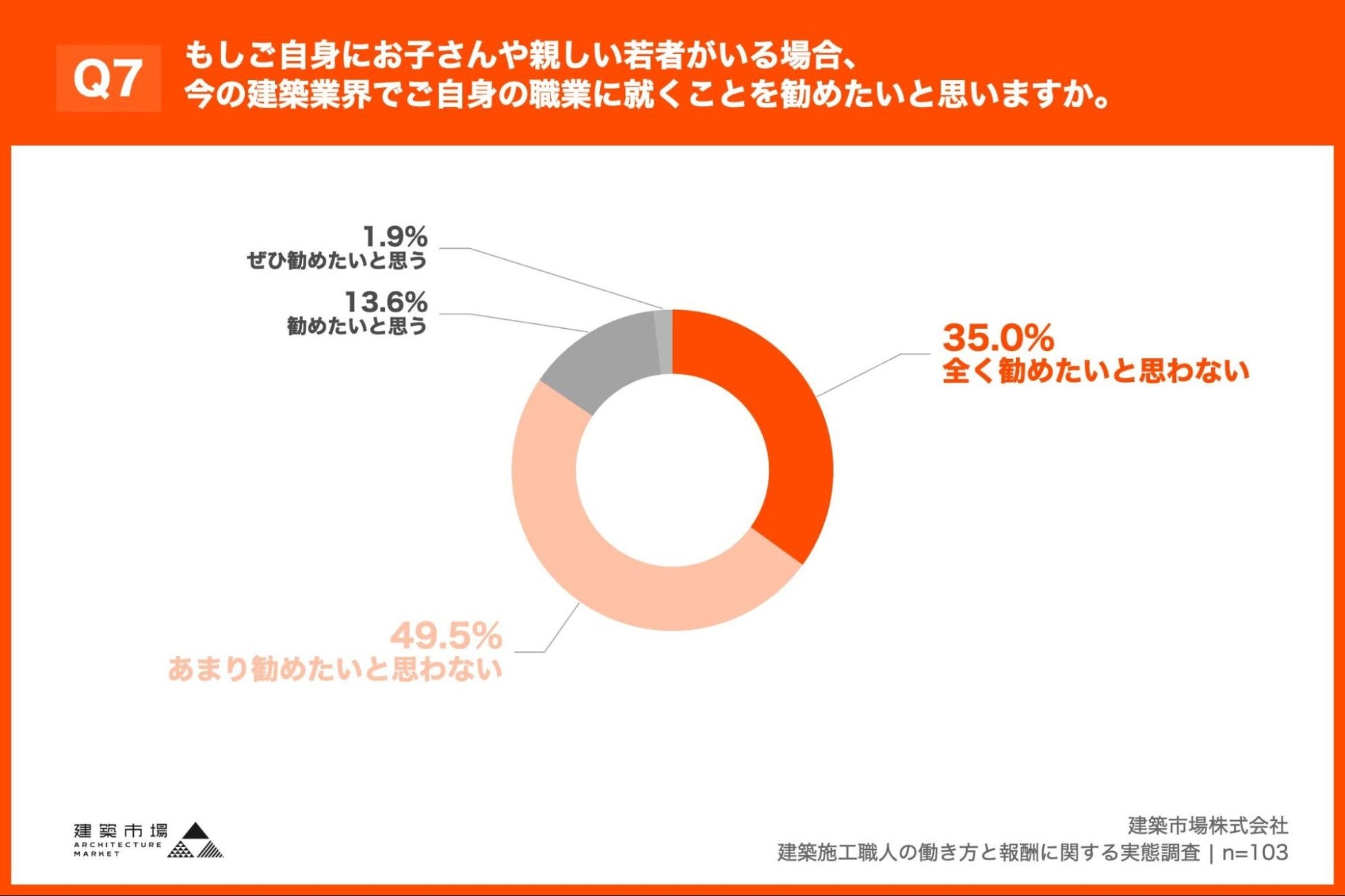 「Q7. もしご自身にお子さんや親しい若者がいる場合、今の建築業界でご自身の職業(職人)に就くことを勧めたいと思いますか。」(n=103)と質問したところ、「全く勧めたいと思わない」が35.0%、「あまり勧めたいと思わない」が49.5%という回答となりました。