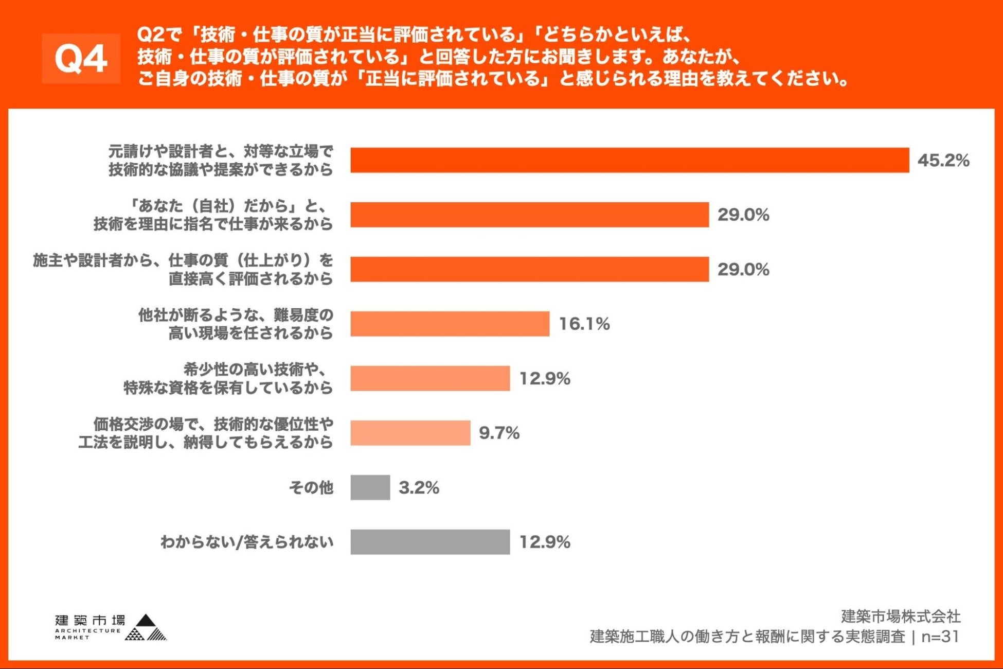 「Q4. Q2で「技術・仕事の質が正当に評価されている」「どちらかといえば、技術・仕事の質が評価されている」と回答した方にお聞きします。あなたが、ご自身の技術・仕事の質が「正当に評価されている」と感じられる理由を教えてください。(複数回答)」(n=31)と質問したところ、「元請けや設計者と、対等な立場で技術的な協議や提案ができるから」が45.2%、「あなた(自社)だから」と、技術を理由に指名で仕事が来るから」が29.0%、「施主や設計者から、仕事の質(仕上がり)を直接高く評価されるから」が29.0%という回答となりました。