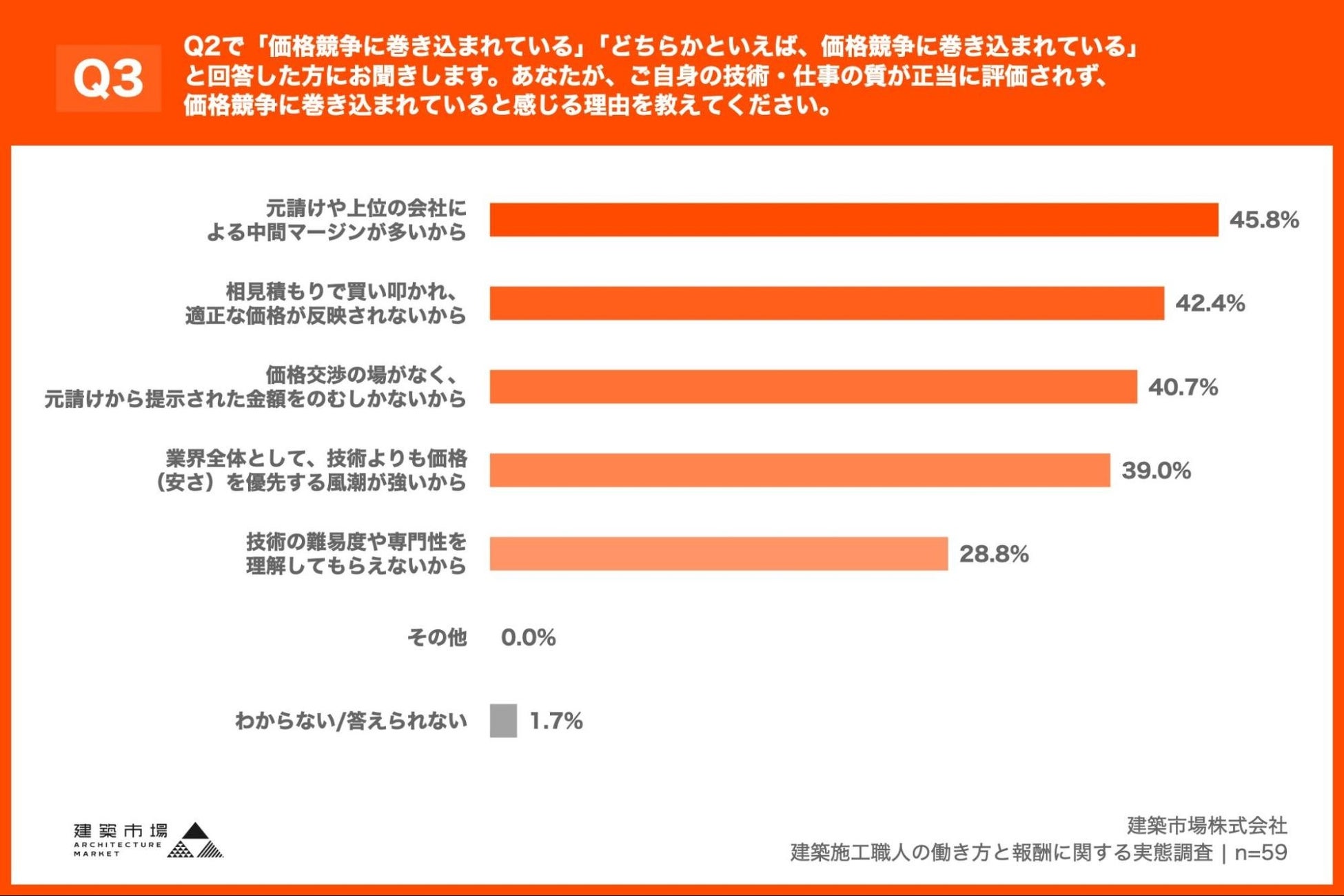 「Q3. Q2で「価格競争に巻き込まれている」「どちらかといえば、価格競争に巻き込まれている」と回答した方にお聞きします。あなたが、ご自身の技術・仕事の質が正当に評価されず、価格競争に巻き込まれていると感じる理由を教えてください。(複数回答)」(n=59)と質問したところ、「元請けや上位の会社による中間マージンが多いから」が45.8%、「相見積もりで買い叩かれ、適正な価格が反映されないから」が42.4%、「価格交渉の場がなく、元請けから提示された金額をのむしかないから」が40.7%という回答となりました。