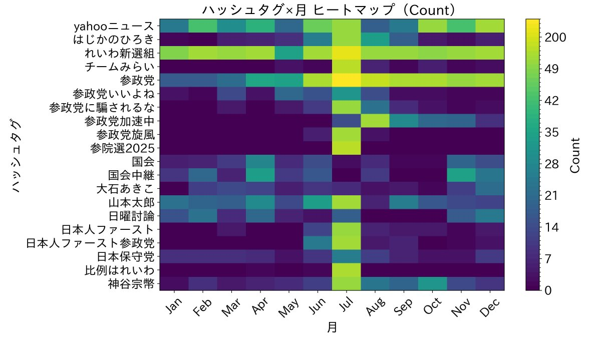 2025年の政治トピックを、ワードクラウド/TTTC/ハッシュタグ推移を用いて月次・通年で整理