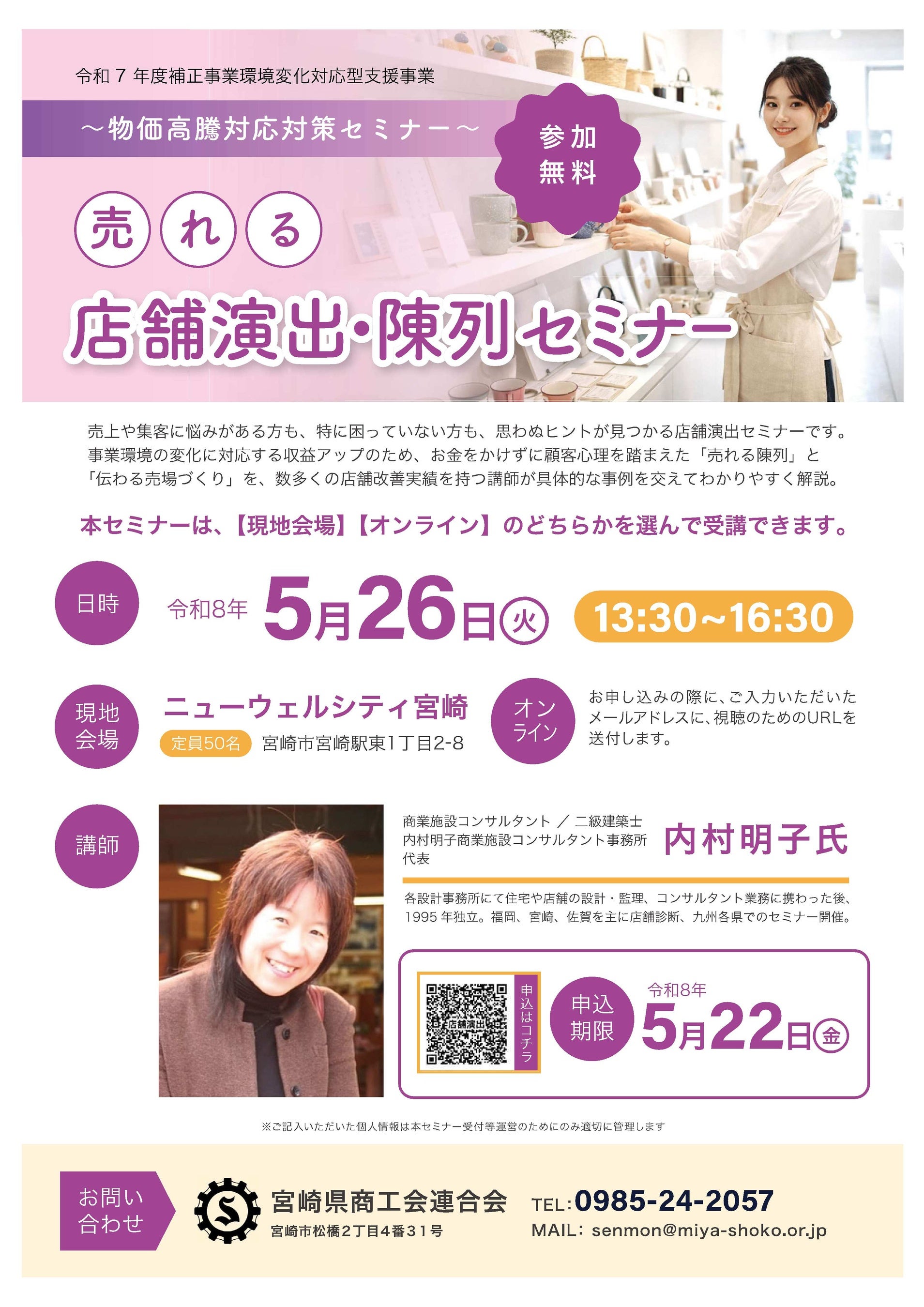 宮崎県商工会連合会では、売上や集客に悩みがある方も、特に困っていない方も、思わずヒントが見つかる店舗演出セミナーを開催します。
