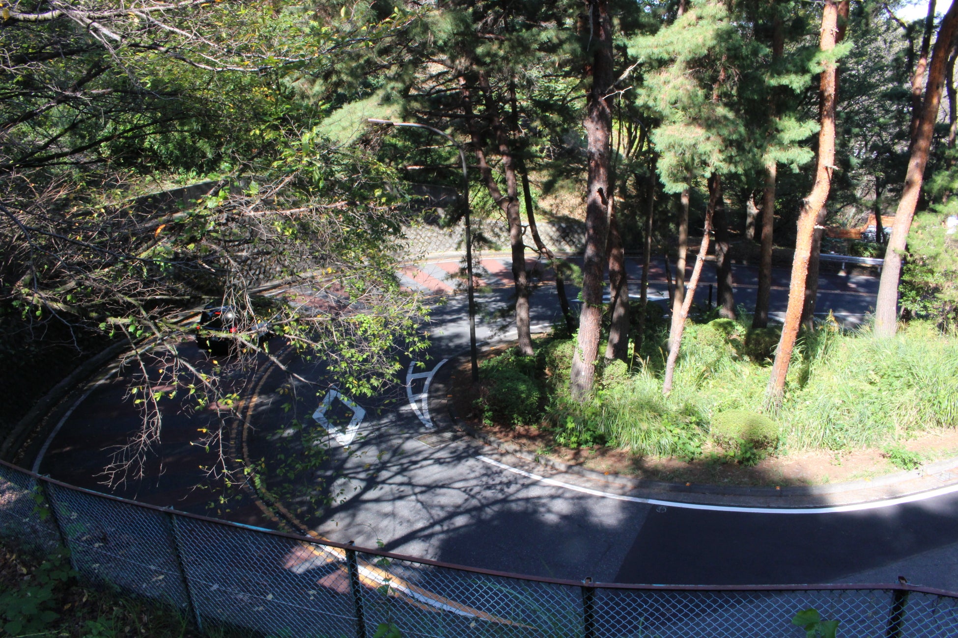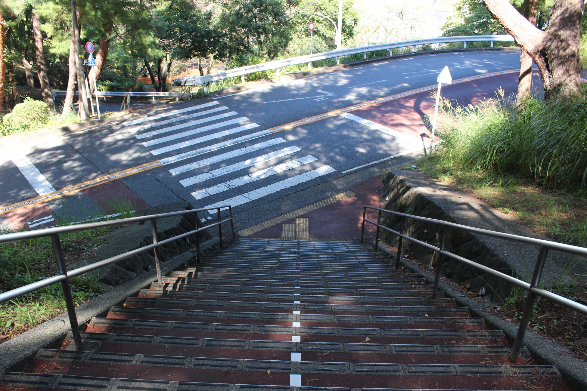 いろは坂の階段から見下ろす風景はとても気持ちの良い絶景です。さらに進んでいくと「金比羅宮」、「天守台跡」の横をとおるカーブがあります。