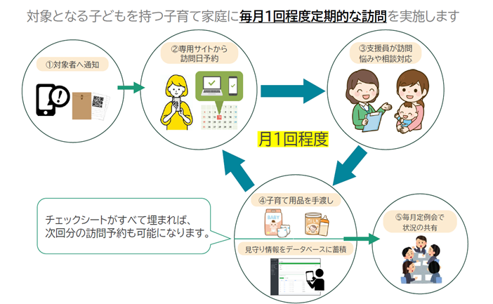 ・対象世帯に事業に関して通知するとともに、専用サイトを立ち上げ、利用者からの申し込みの受付、訪問日時の選択、育児用品の選択などを簡単に行えるようにしています。