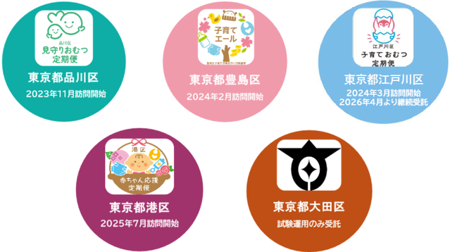 TNCプロジェクトでは、来年度からも継続受託した『江戸川区子育ておむつ定期便』の他にも、2023年11月から『品川区見守りおむつ定期便』、2024年2月から『豊島区子育てエール』、2025年7月から「港区赤ちゃん応援定期便」など、見守り訪問事業を受託・運営しています。その件数は、のべ6件となりました。