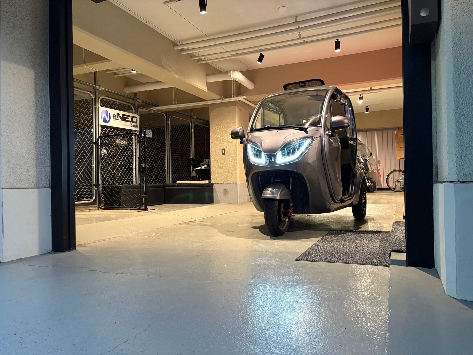 e-NEOは「3人乗り小型EVモビリティ」「普通免許で運転可能」「車検・車庫証明不要」という都市生活に最適な特徴を備えています。利便性・安全性・経済性を兼ね備え、日常の移動やレジャーなど多様なシーンで新しいモビリティ体験を提供します。