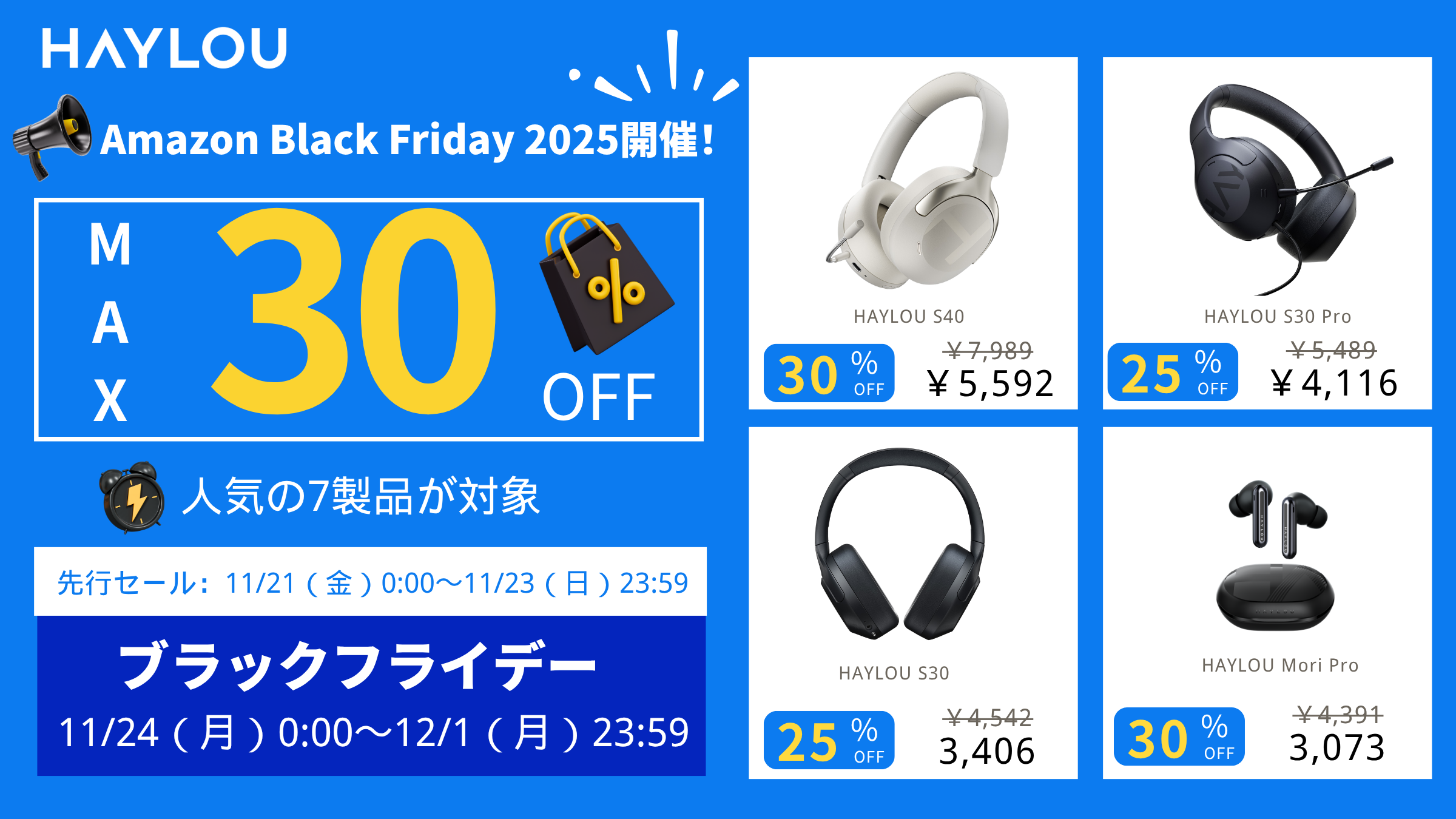 オーディオブランド HAYLOU(ヘイロウ)は、Amazon日本公式ストアにて開催される「ブラックフライデー2025」に参戦し、人気の頭戴式ヘッドホンおよびTWSイヤホンを対象に特別プロモーションを実施いたします。