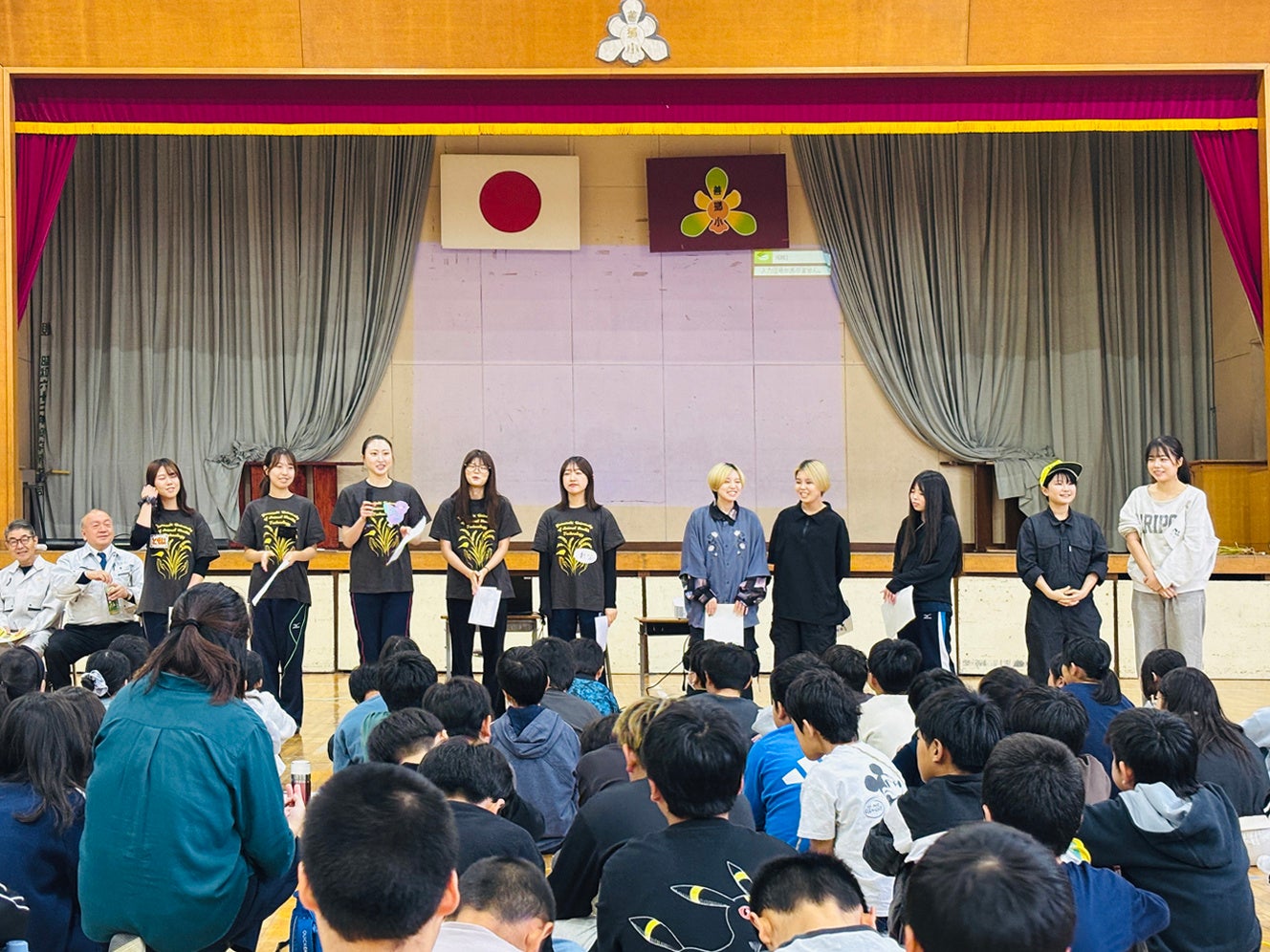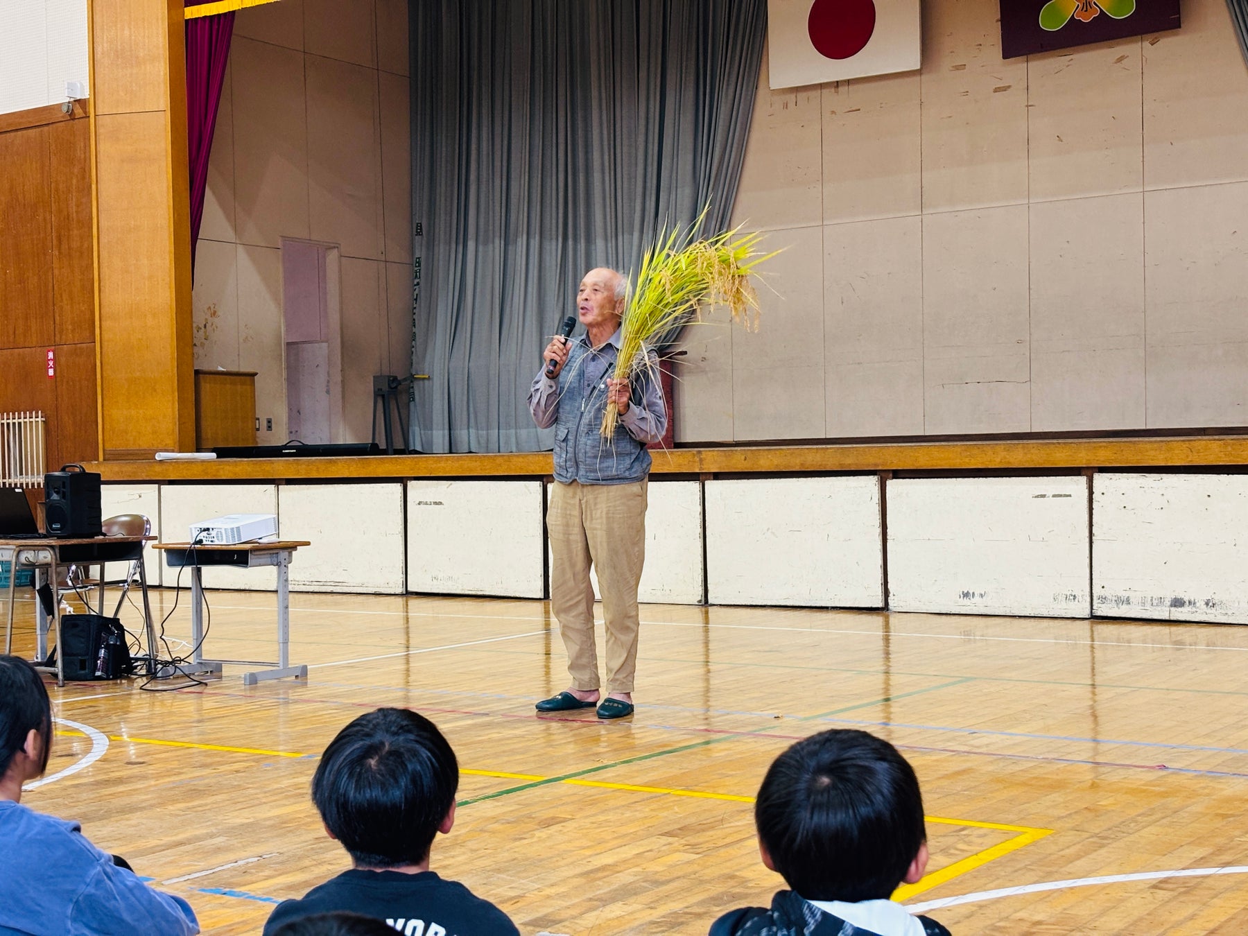 毎年、田んぼの学校開校式では子どもたちや大学生による稲刈りが行われますが、当日は前日から続いた雨のため、急遽町内の小学校の体育館で開校式が行われました。