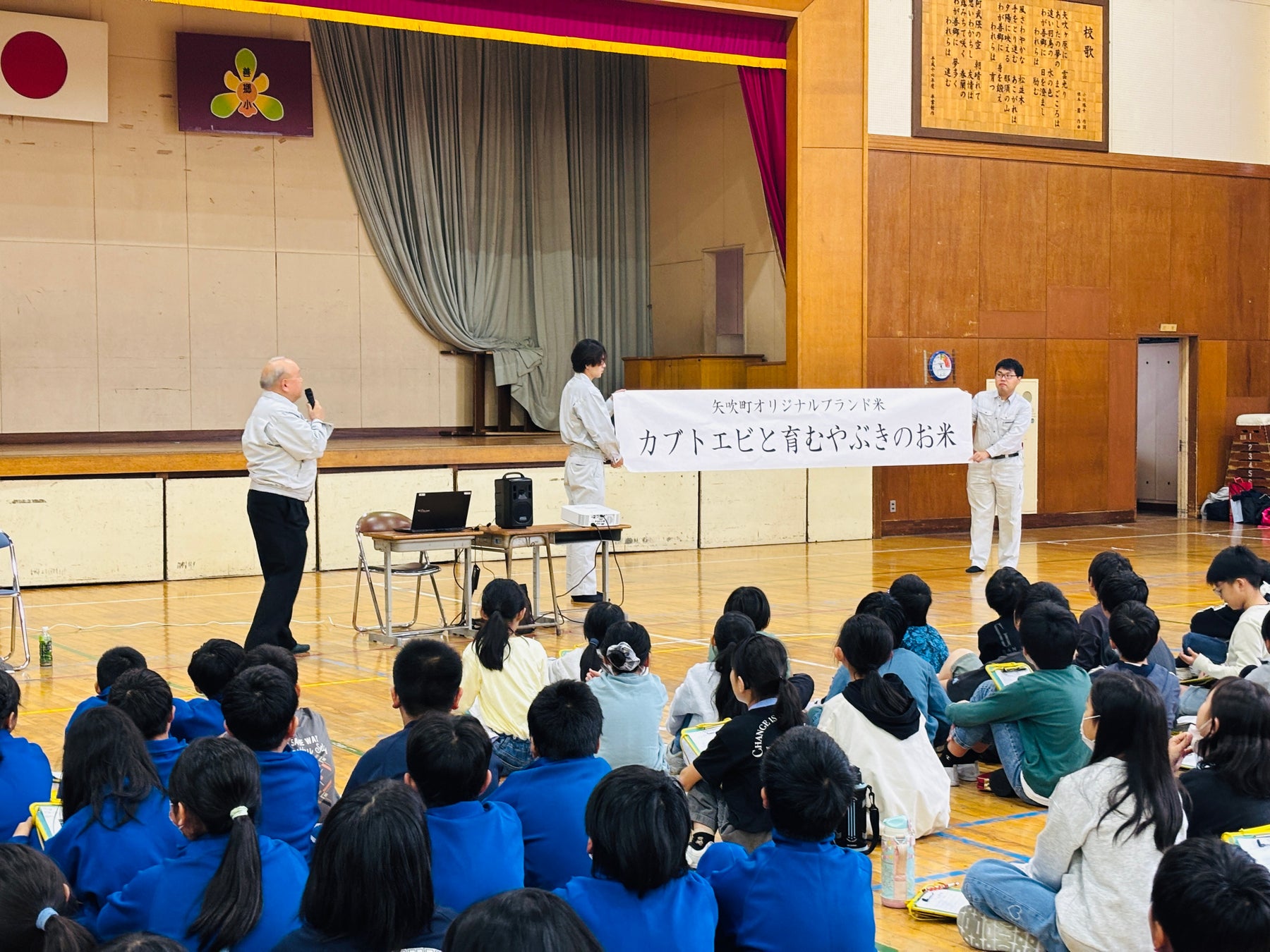 2025年10月15日(水)に町内の小学校で行われた田んぼの学校開校式。蛭田泰昭町長から「カブトエビと育むやぶきのお米」のネーミングとパッケージデザインが発表されました。開校式には、今年の田植えに参加した小学生たちと、東京農業大学、ヤマザキ動物看護大学の学生たちが参加しました。