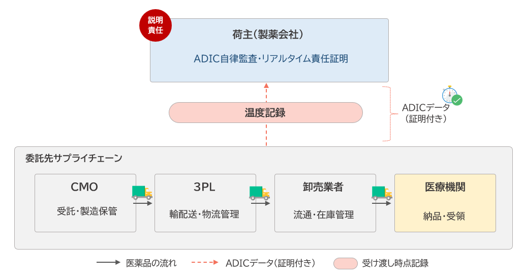 ADICは、契約・法律で定められた内容通りに物流が進んでいるかどうかを、受け渡し時点のログデータから荷主側がリアルタイムで監査・意思決定できる技術です。