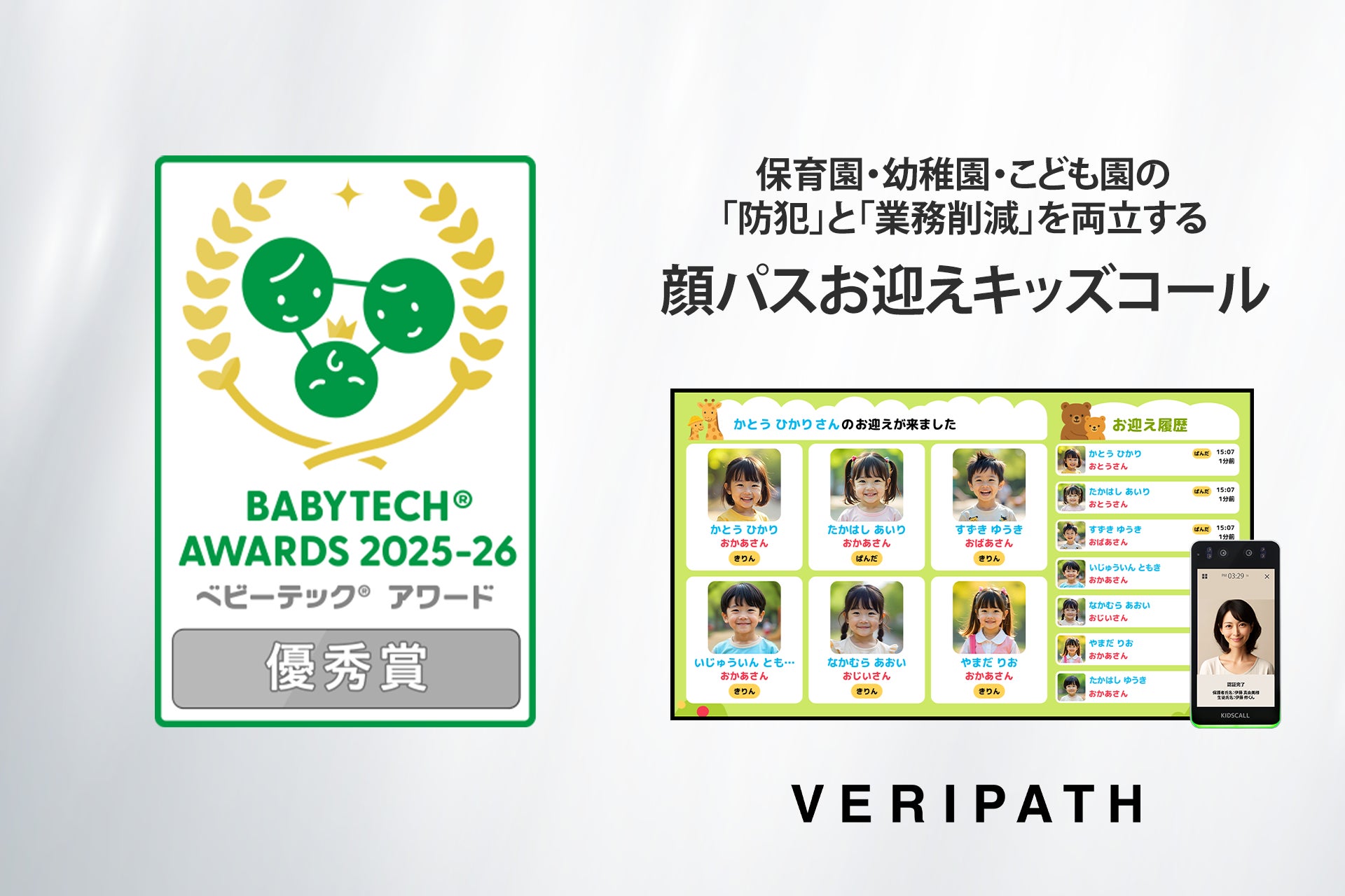 株式会社VERIPATH(本社:兵庫県神戸市、代表取締役:山岡 源)が提供する、保育施設向け顔認証お迎え自動化システム『KIDSCALL(キッズコール)』は、日本最大級の保育テック表彰「BabyTech® Awards 2025-26」において、その革新性と社会課題への貢献度が評価され、【保育ICT 保育中の事故防止部門 優秀賞】を受賞いたしました。