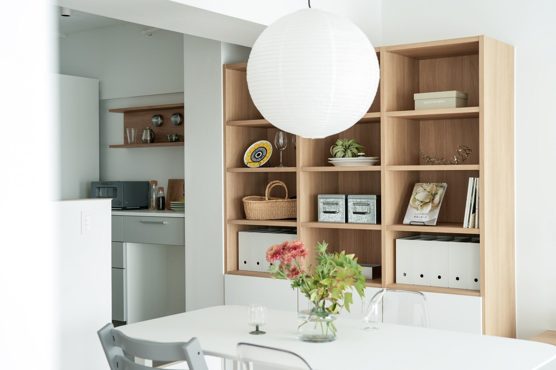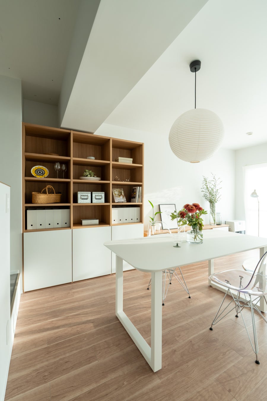 雑多になりがちなダイニングには、”飾る”と”しまう”を両立させる大容量の収納棚を配置。