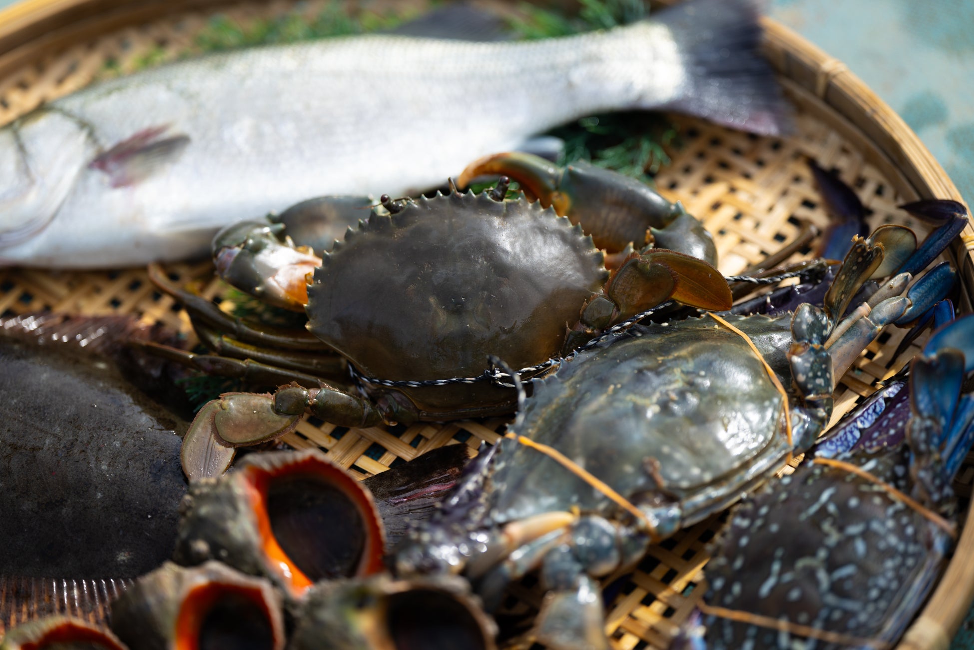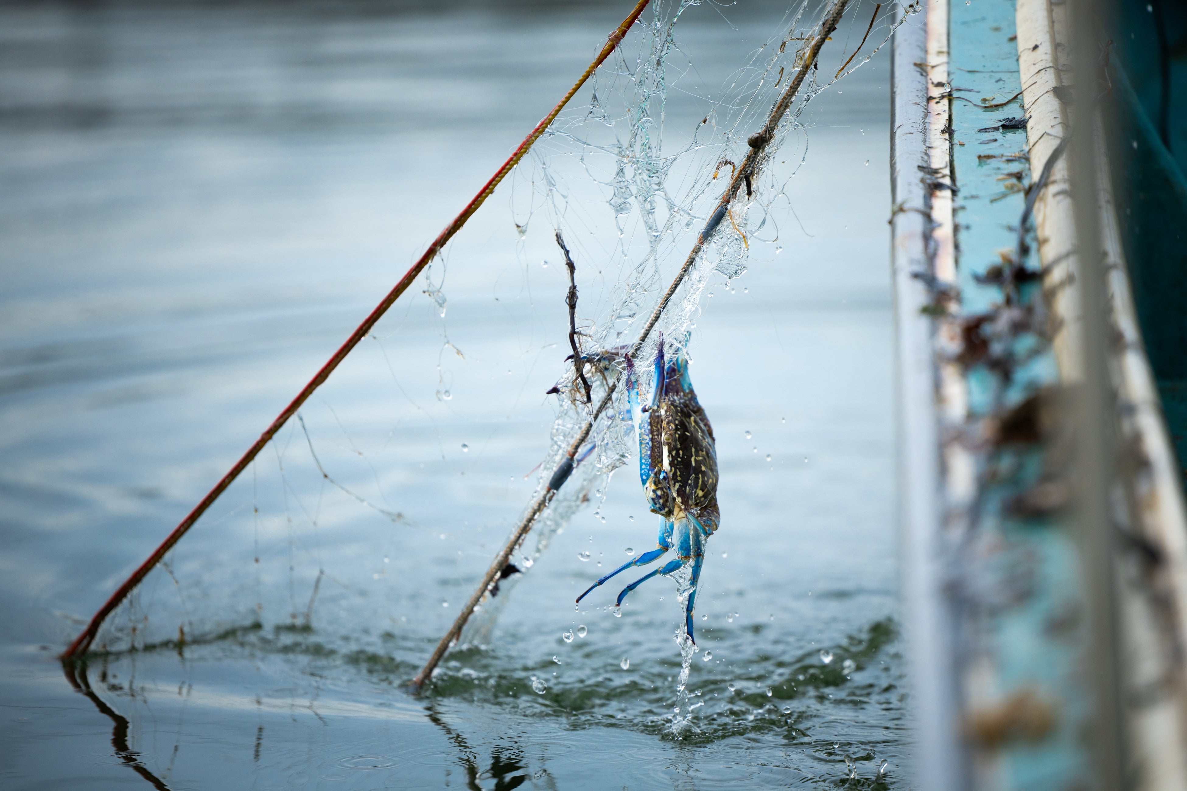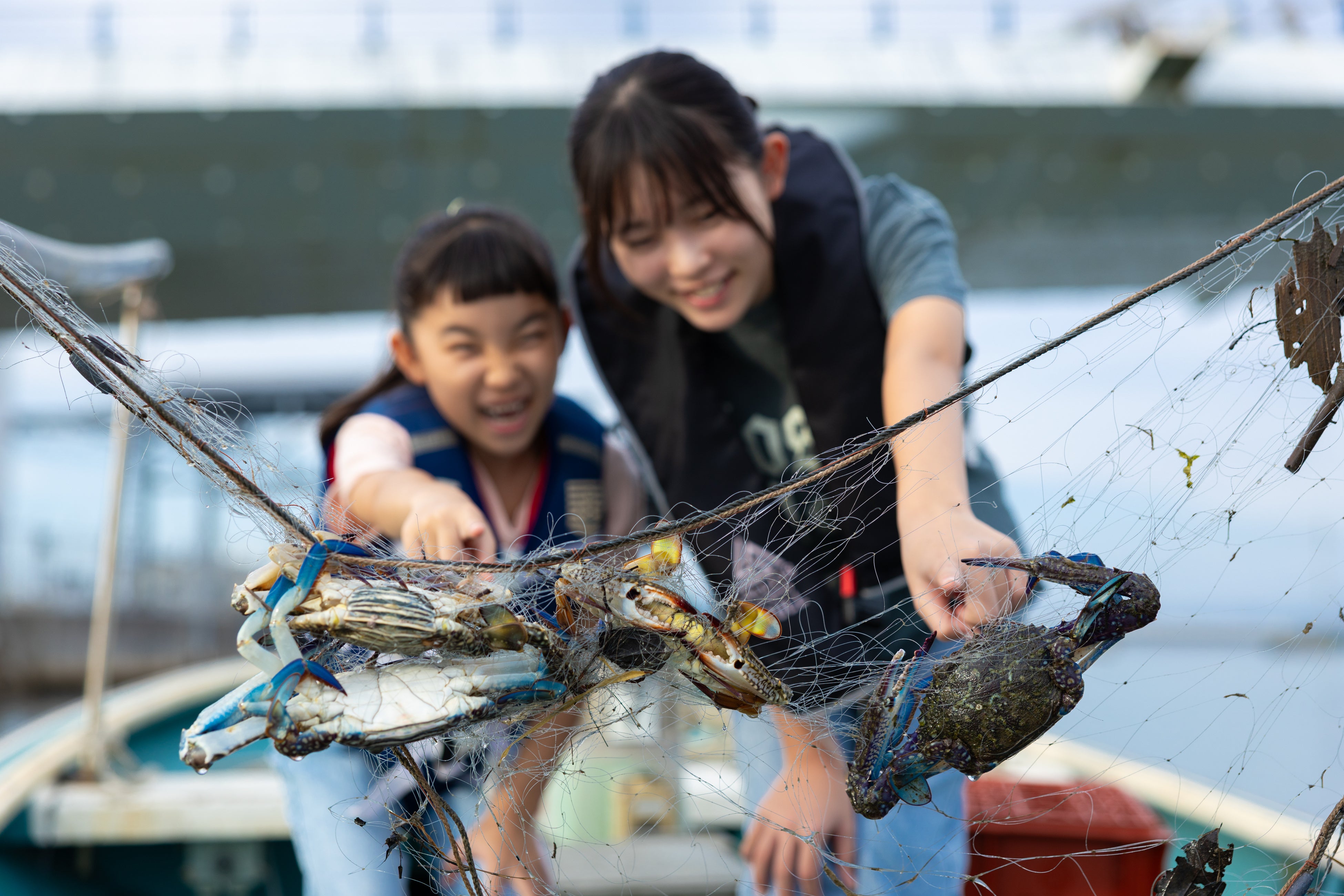 潮の流れの変化により、えびすき漁は5月~8月がシーズンになり、9月以降は渡り蟹を中心とした刺し網漁が盛んにおこなわれます。刺し網漁とは事前に片方に重しのついた網を数十メートル仕掛けます。カニや魚は夜行性であるため、夜の間に網にかかり、翌日、網を引き揚げるだけで、ワタリガニ、ドウマンガニ(幻の蟹)、コチ、ヒラメ、黒鯛など様々な海産物が取れます。そのほかに、ヒトデやタツノオトシゴ、ウニなども取れます。
