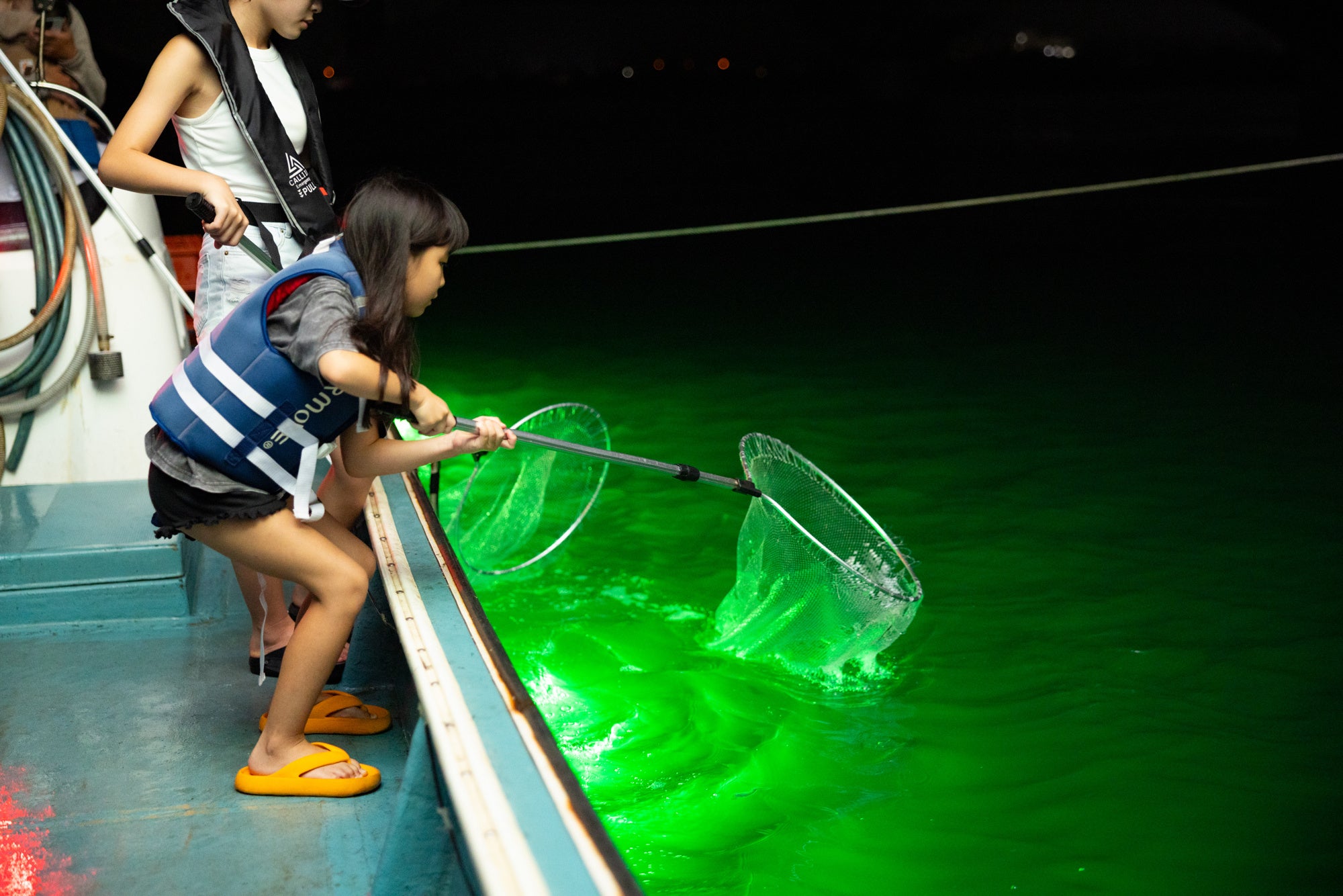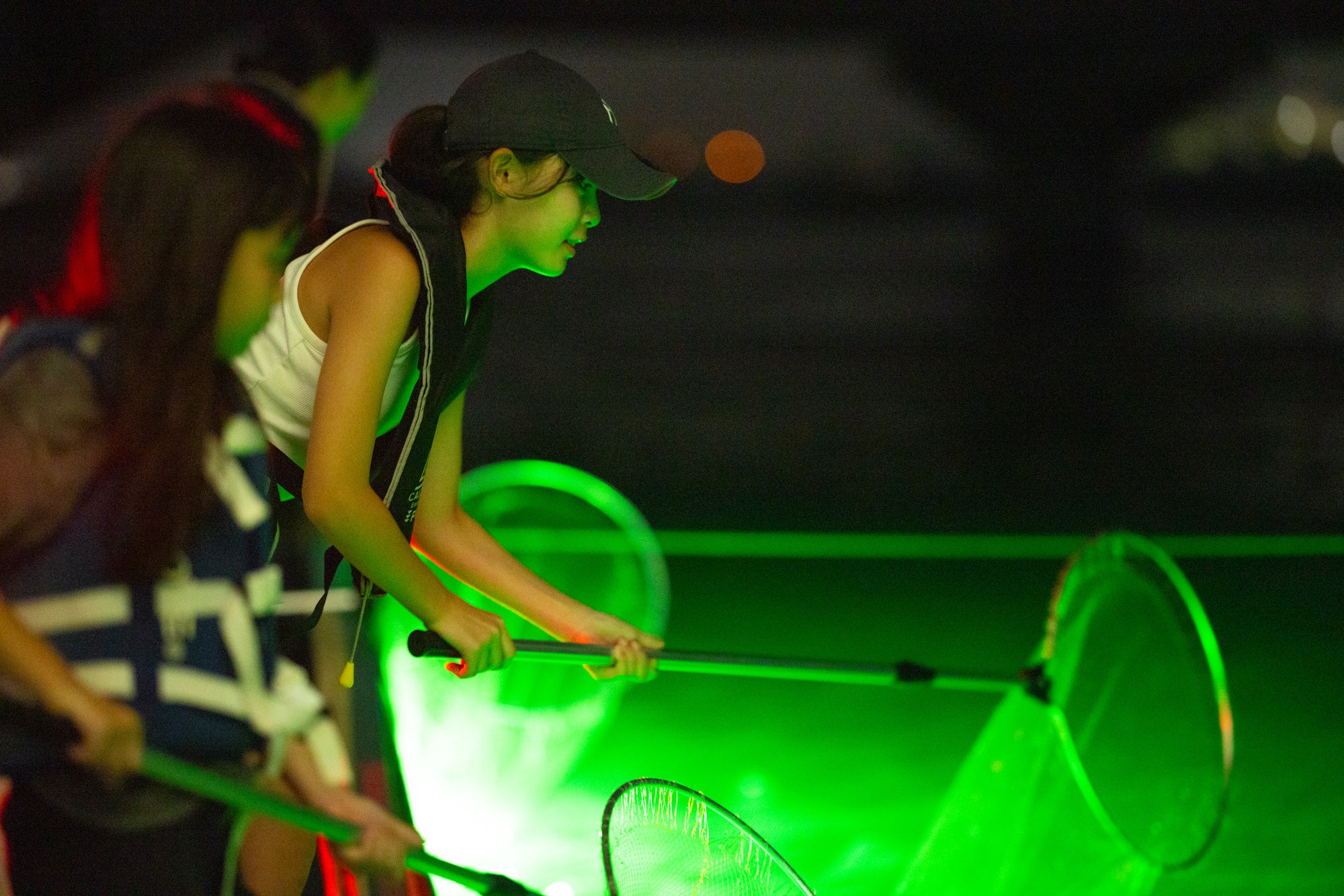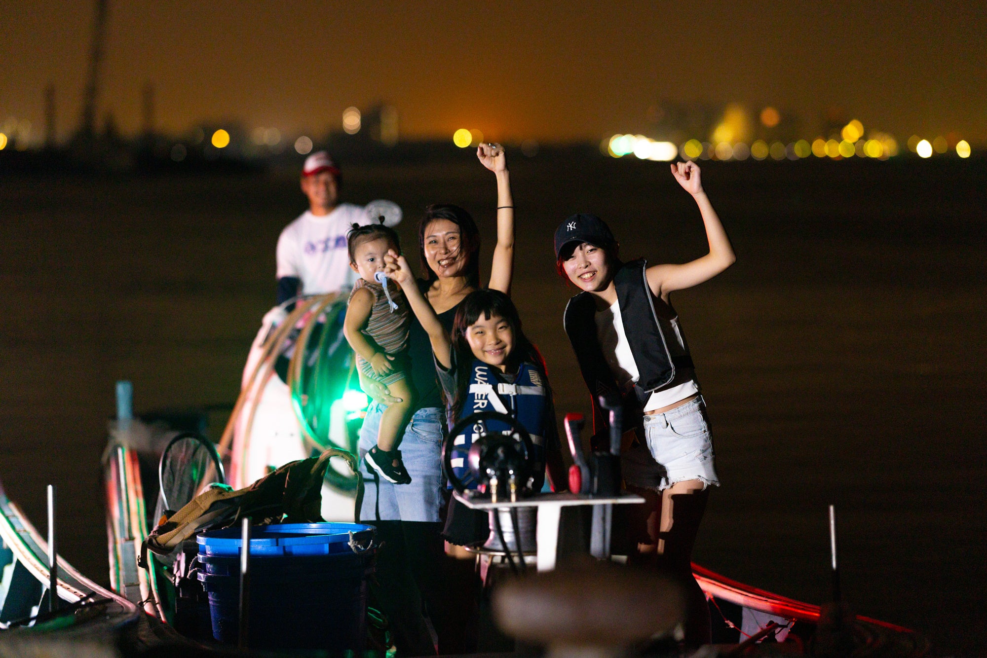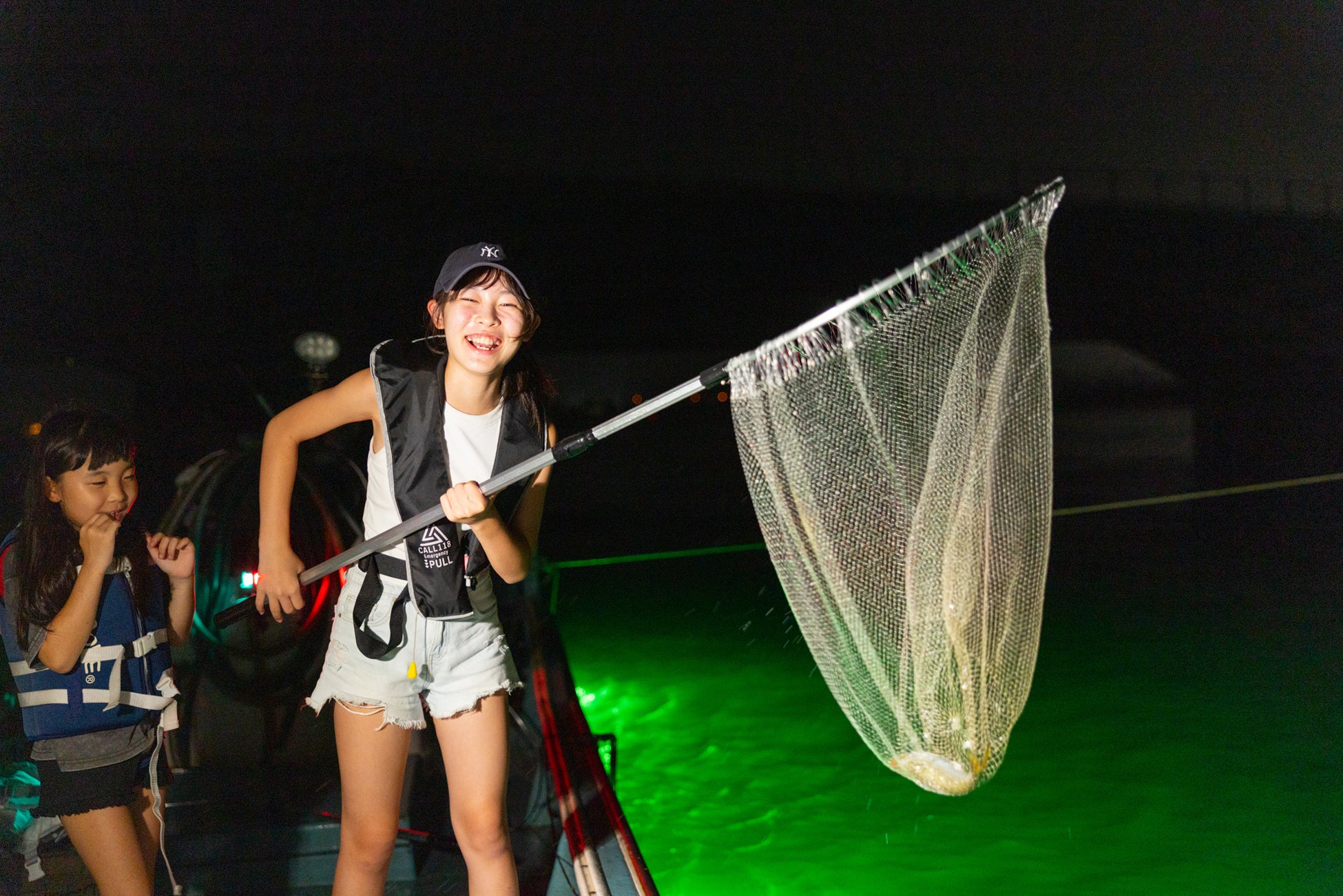 エビスキ漁は浜名湖が汽水湖であるため、湖 という名前を冠していますが、海と繋がっています。そのため、潮の 満ち引きが存在し、潮にのって流れてくるエビやカニ、イカや魚を捕 る漁法です。多い時には天然の車エビが200匹ほどすくえることもあります。小学⽣でも網ですくうだけなので、簡単にとることがで きます。