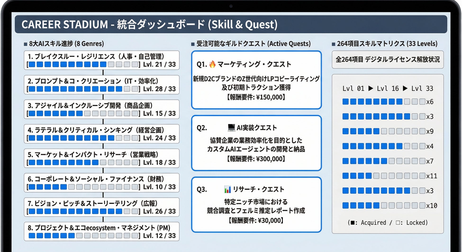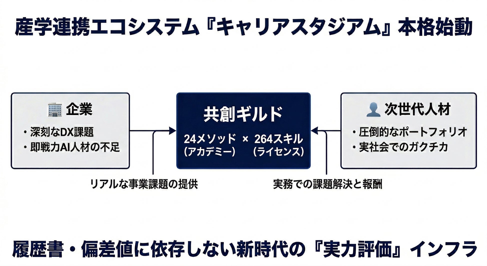 産学連携エコシステム『キャリアスタジアム』始動。「24メソッド」と「264スキル」による「共創ギルド」で、企業のDX課題解決と次世代人材のポートフォリオ形成を直結。書籍『総合型選抜のすすめ』同時刊行。