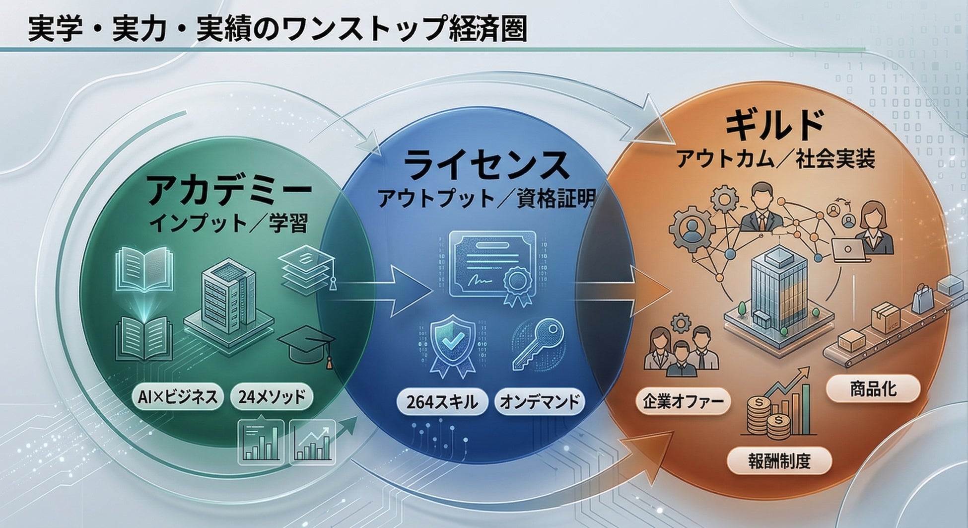 本システムは、「ACADEMY(実学)」「LICENSE(実力)」「GUILD(実績)」の3つのフェーズを一気通貫で提供します 。