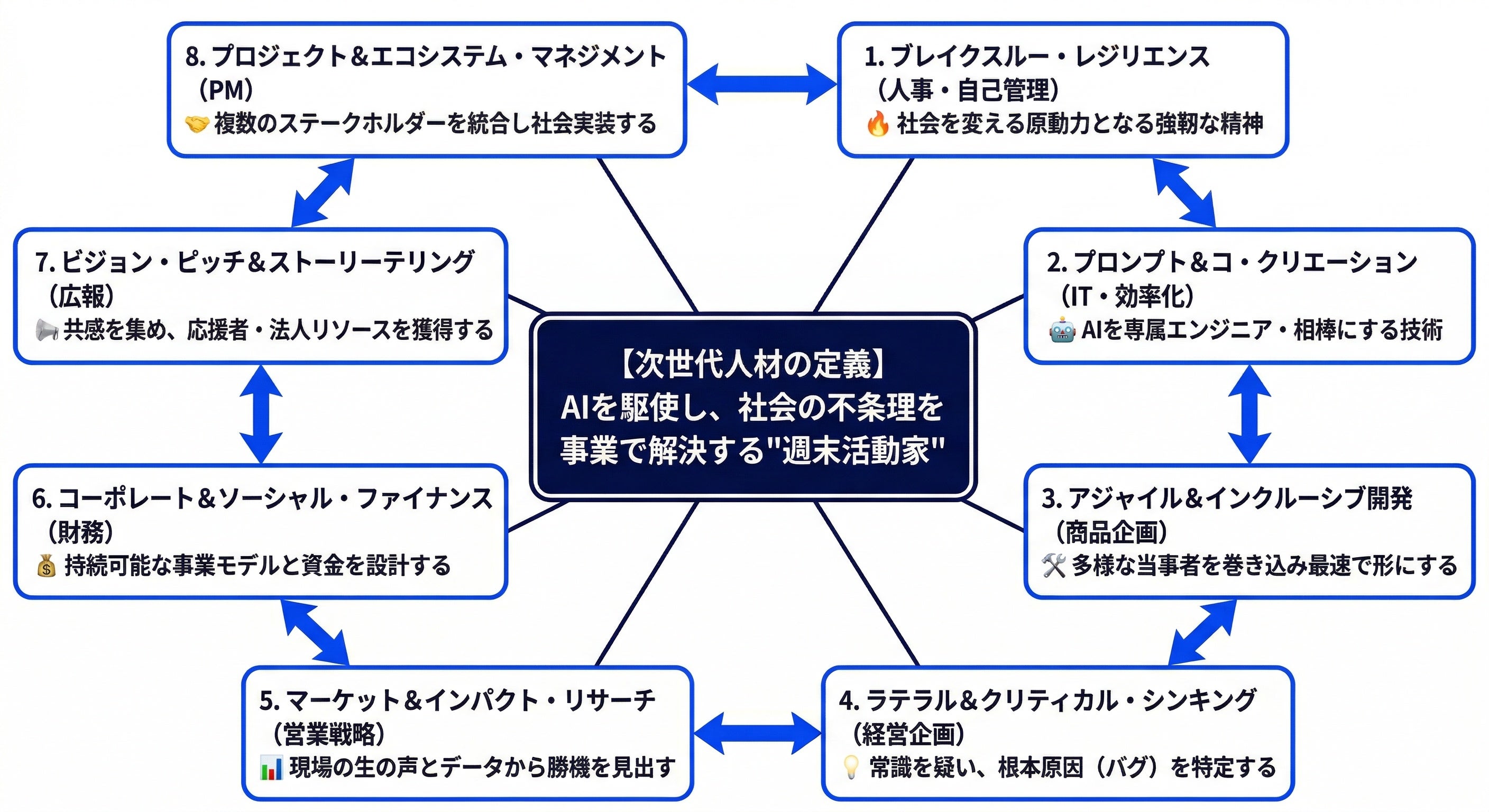 本書では、AI時代における「偏差値教育」の限界と、それに代わる「実学教育」の重要性を説き、当エコシステムの中核である「24メソッド」や「264スキル」、そして「共創ギルド」がどのように若者の未来を変えるのかを、豊富なデータと実践的なロードマップとともに徹底解説しています。キャリアスタジアムに参加を検討される方や、教育の新しい形を模索される保護者・教育関係者様にとって必読のバイブルとなっています。