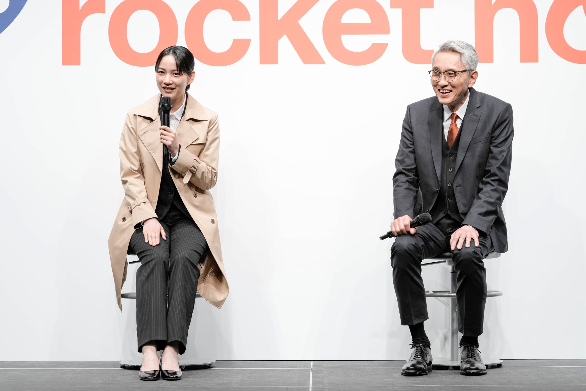 発表会では、フードデリバリーアプリの200万ダウンロード突破や、送料・サービス料ゼロに加えてメニュー価格も店舗と同価格で注文できる「ゼロ配MAX」プロモーション*、配達地域の拡張など、ロケットナウの最新ニュースが紹介された後、新CM「ゼロ配刑事編」が初披露されました。続いて、第1弾CM「新時代宣言編」での共演が話題を呼び、第2弾となる「ゼロ配刑事編」でもW主演した俳優の松重豊さん、俳優・アーティストののんさんが登場。刑事役の感想や撮影時のエピソードなどお2人によるトークセッションがスタートしました。