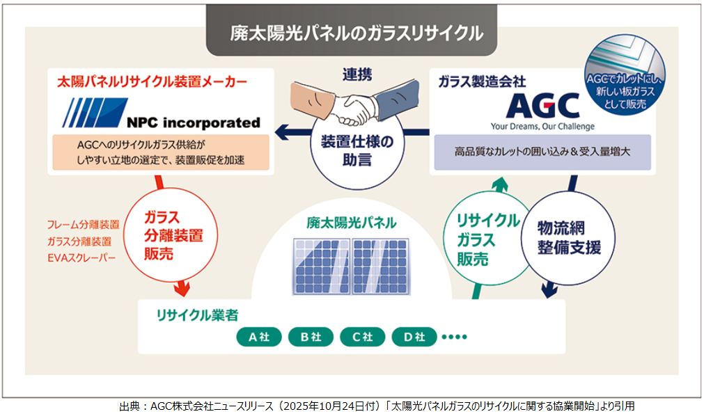 本件については、2025年10月24日付でエヌ・ピー・シーが発表した「太陽光パネルリサイクルに関するAGC株式会社との連携開始」および、AGC が発表した「太陽光パネルカバーガラスの水平リサイクル拡大に向けてエヌ・ピー・シー社と連携を開始」も併せてご覧ください。