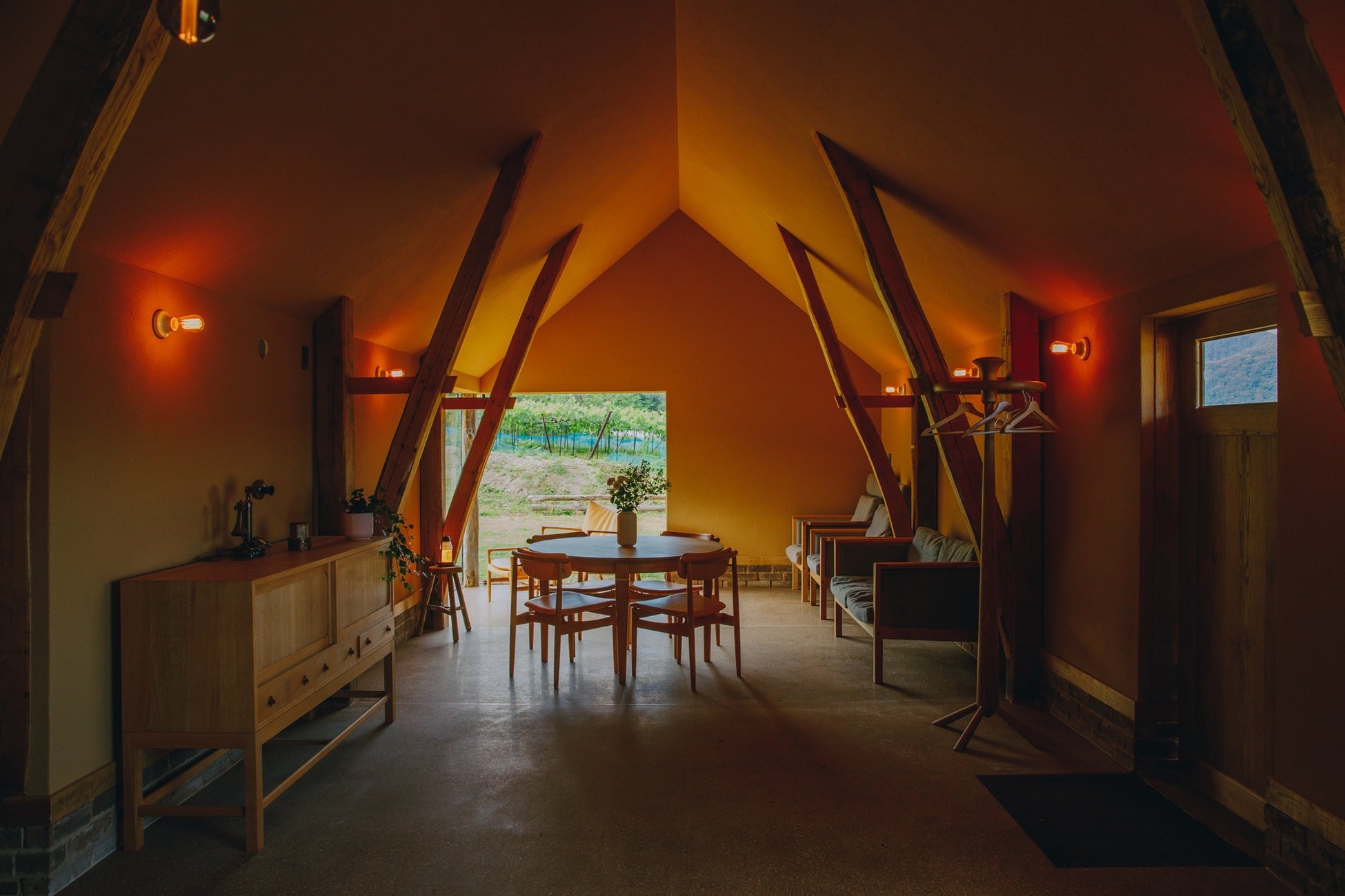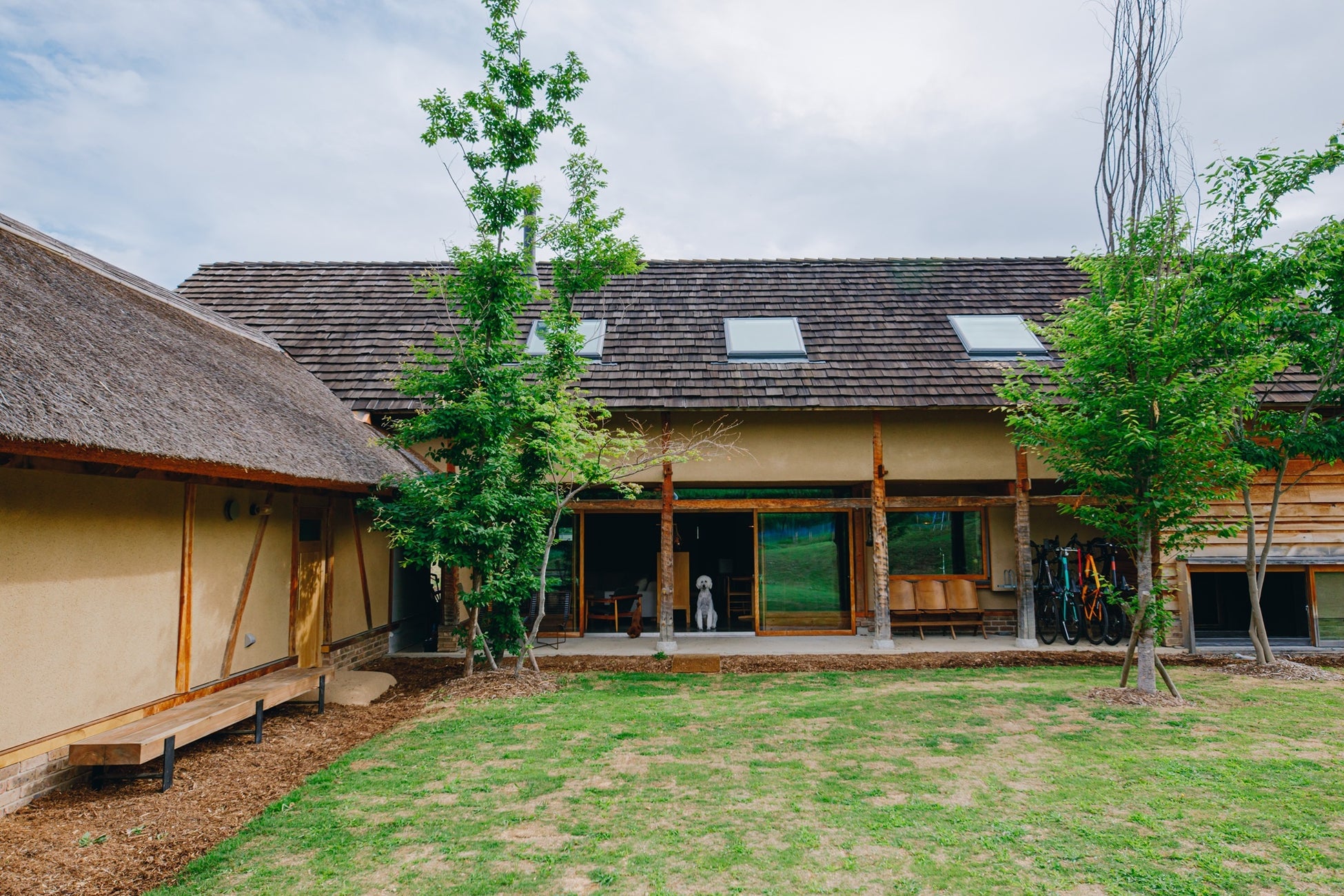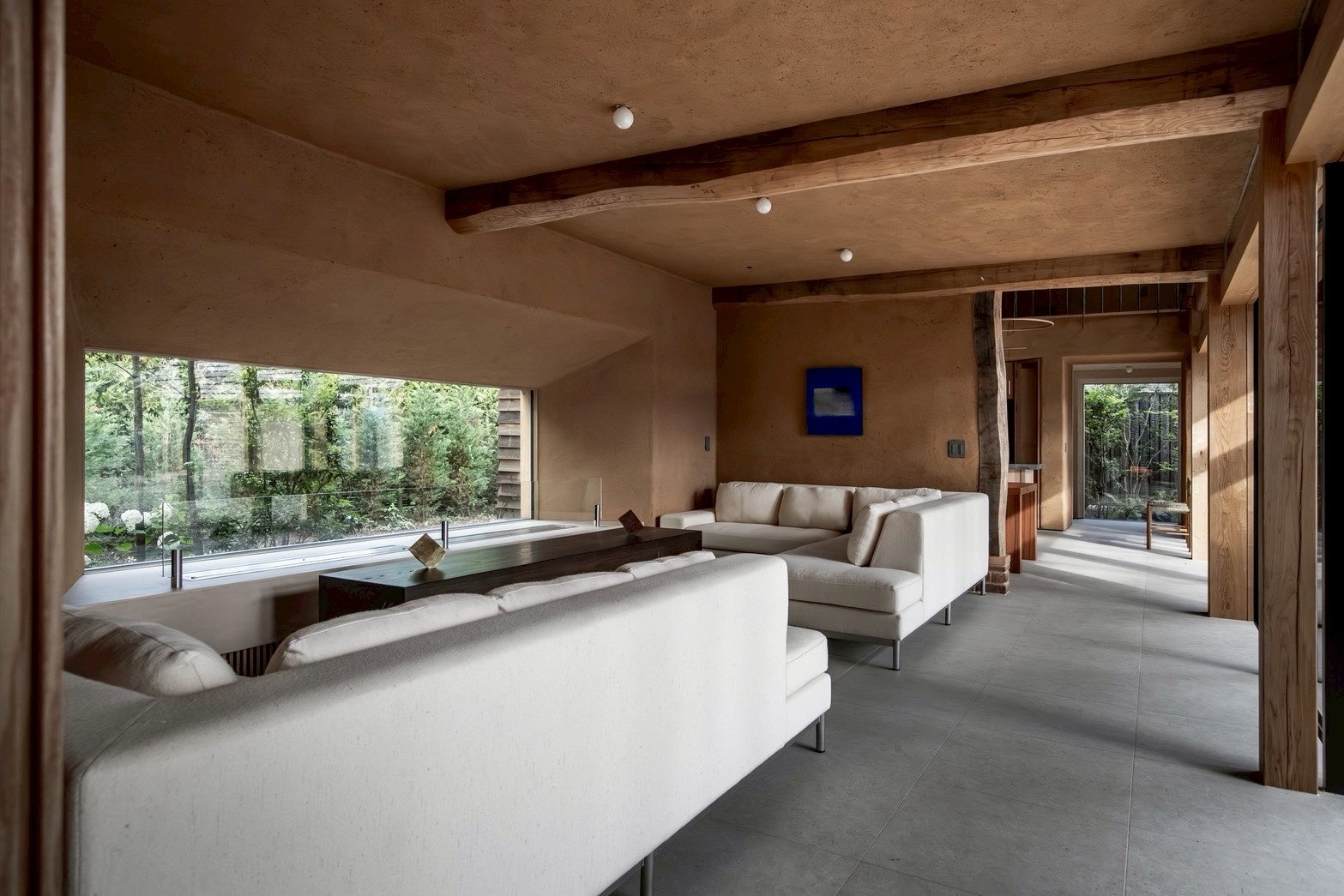 本住宅は、同社代表・菱田昌平の自邸として建設されたもので、ティンバーフレーム構法と自然素材を融合した設計が特徴。