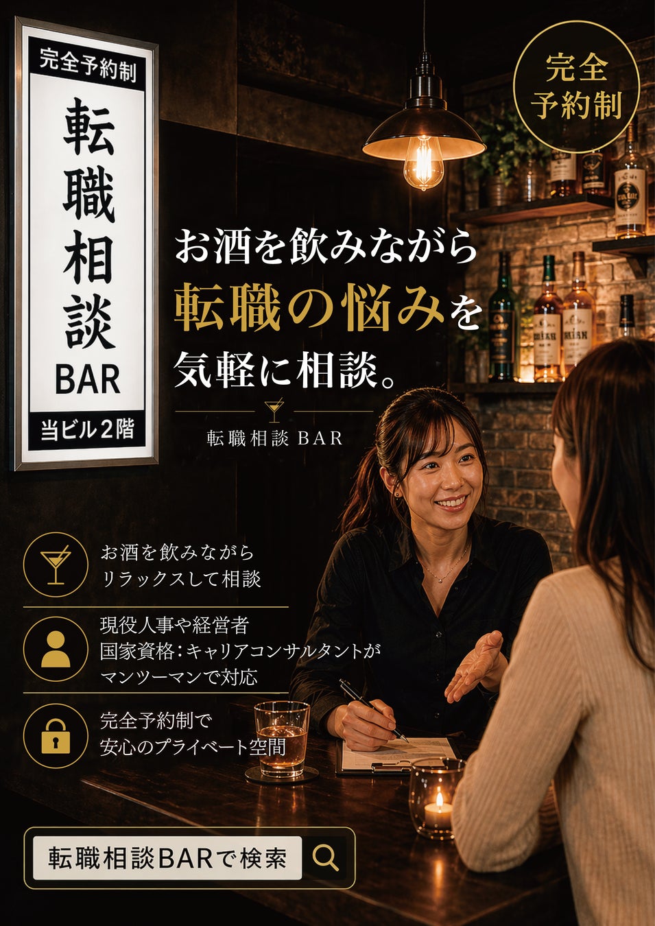転職相談BARは、転職したい人のためだけの場ではなく、仕事終わりに立ち寄って、自分のキャリアを本音で整理できる場です。会議室では出ない本音を引き出すこと、転職前提ではない悩みから相談できること、そしてその先で本当に合う選択肢を一緒に考えることに価値があると思っています。