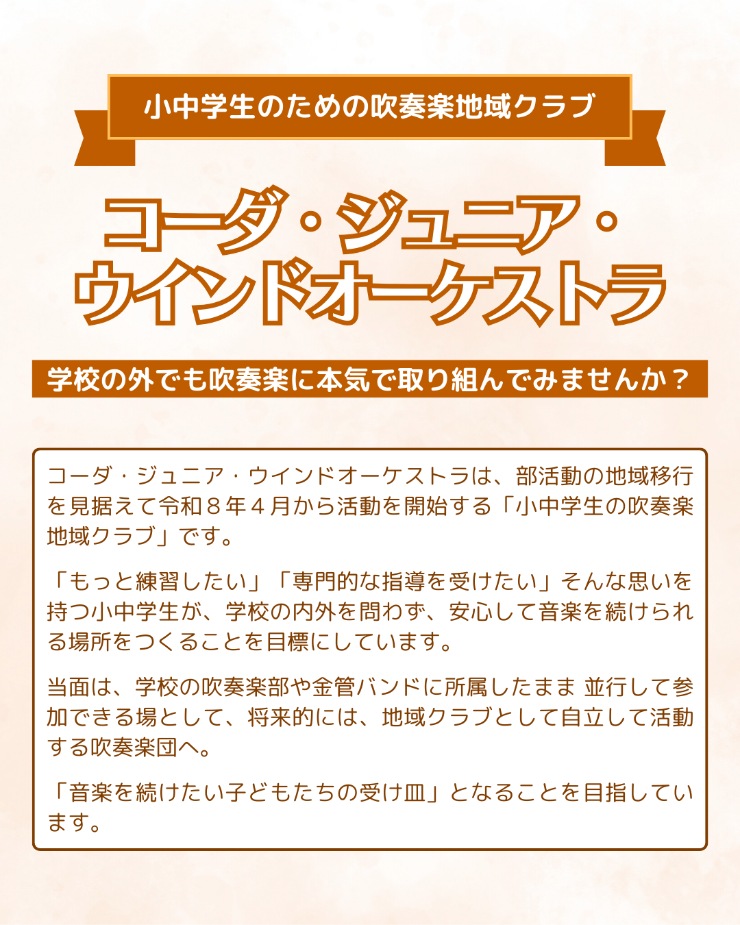 「コーダ・ジュニア・ウインドオーケストラ」は、こうした状況の中で「もっと合奏したい」「質の高い指導を受けたい」「仲間と演奏を続けたい」という小中学生の思いに応える、吹奏楽地域クラブです。小学4年生から中学生までを対象に、学校の吹奏楽部・金管バンド等とのダブル所属も想定し、週2回の合奏練習を基本に活動します。年1回の演奏会や地域イベントへの出演、人数に応じたコンテスト・コンクールへの挑戦も視野に入れています。