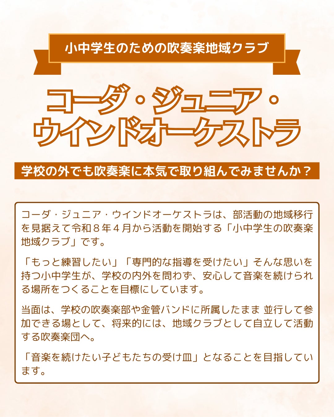 「コーダ・ジュニア・ウインドオーケストラ」2026年4月始動へ—練習体験会&説明会を2/11・2/21・3/2開催
