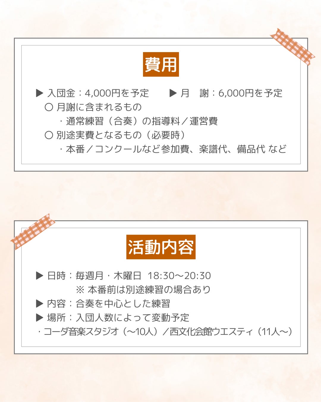 別途費用(必要時):本番・大会参加費、楽譜代、備品代等
