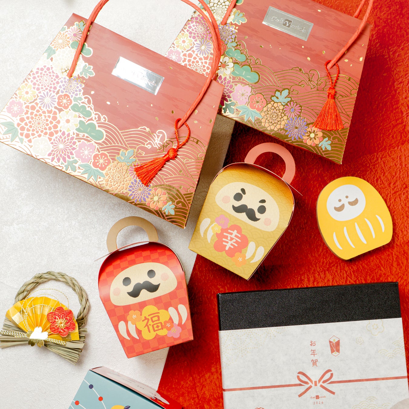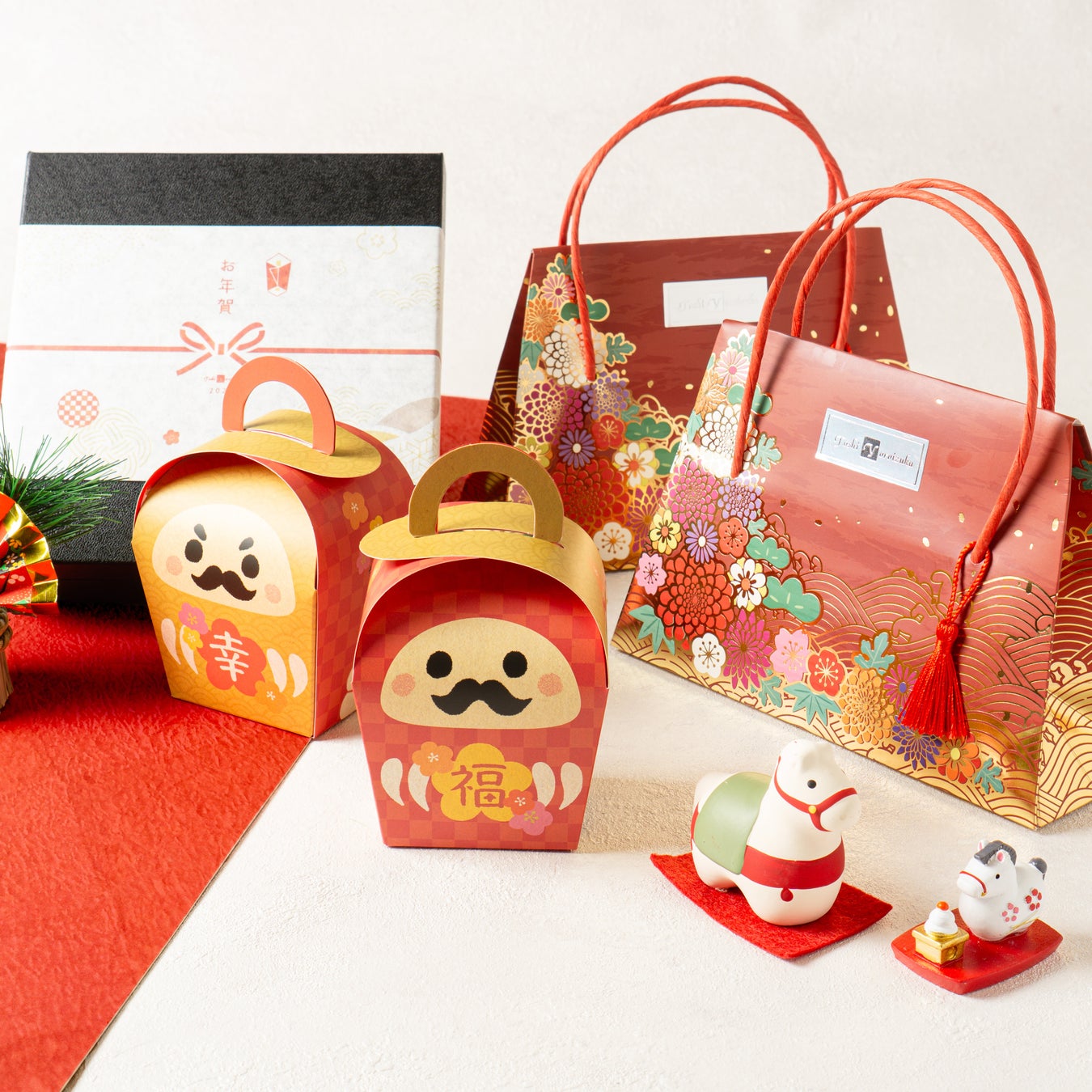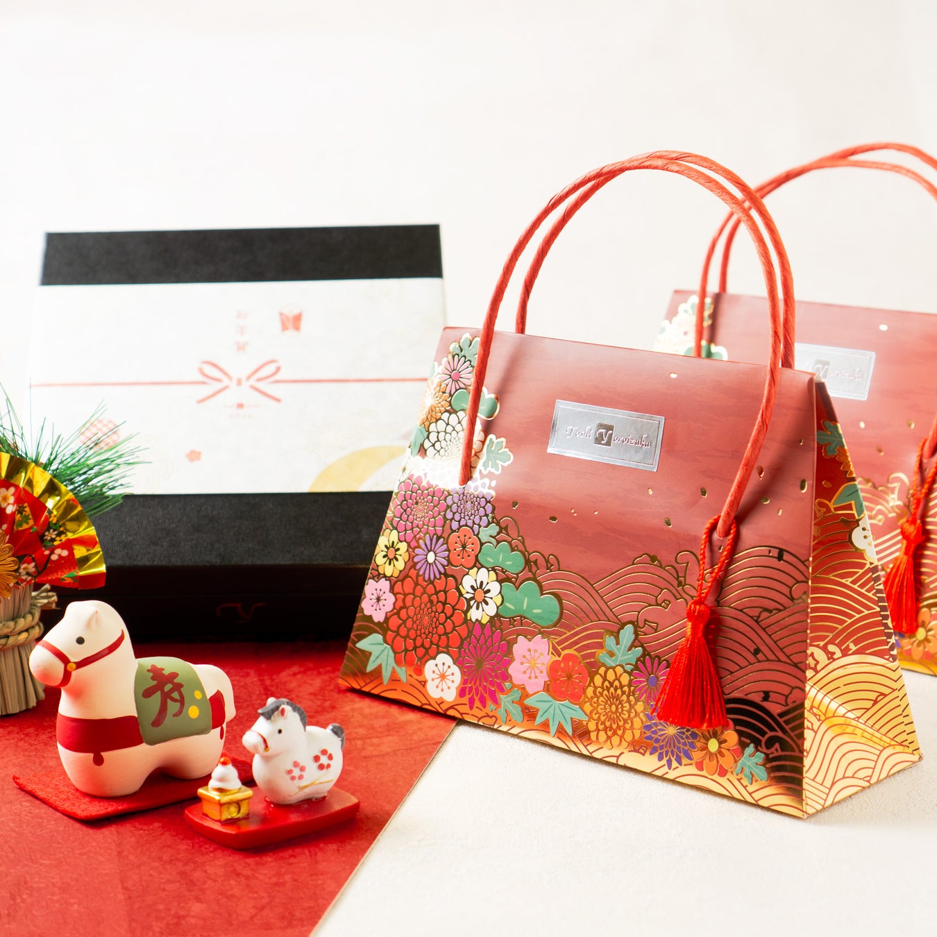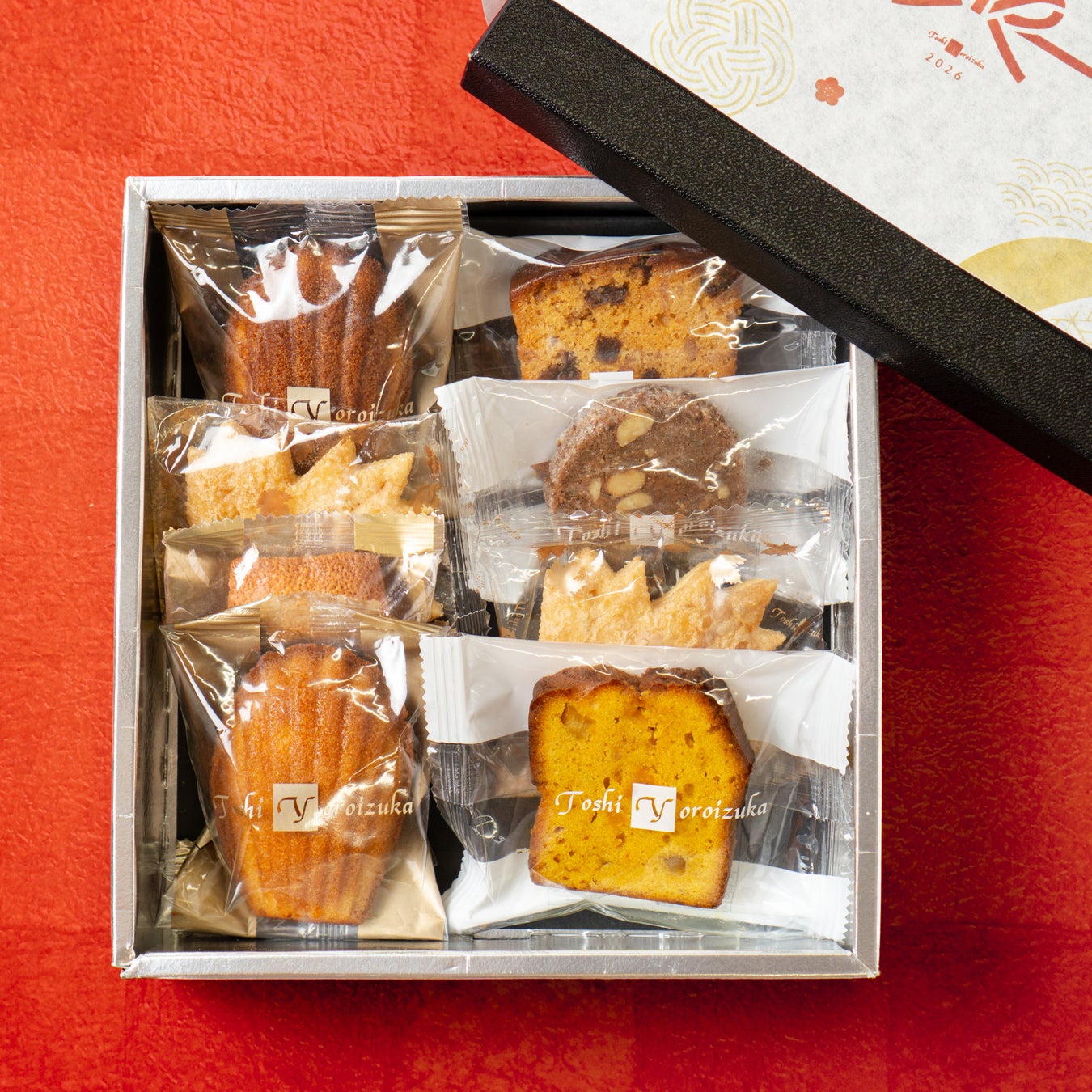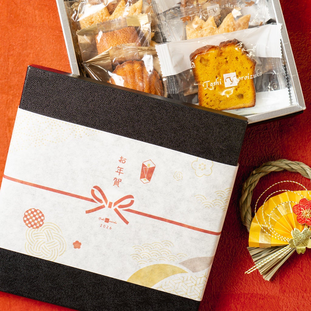 柚子がふんわりと香る限定「柚子マドレーヌ」など人気の焼菓子をお正月にぴったりの華やかなボックスに詰めました。年末年始のお手土産におすすめです。