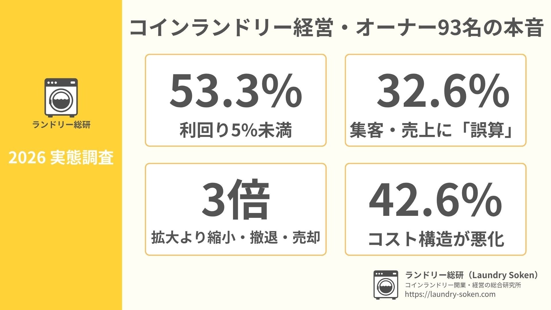 【ランドリー総研】コインランドリー経営 実態調査2026、半数以上が利回り5%未満——正しい情報と相談相手があれば、変わる結果がある