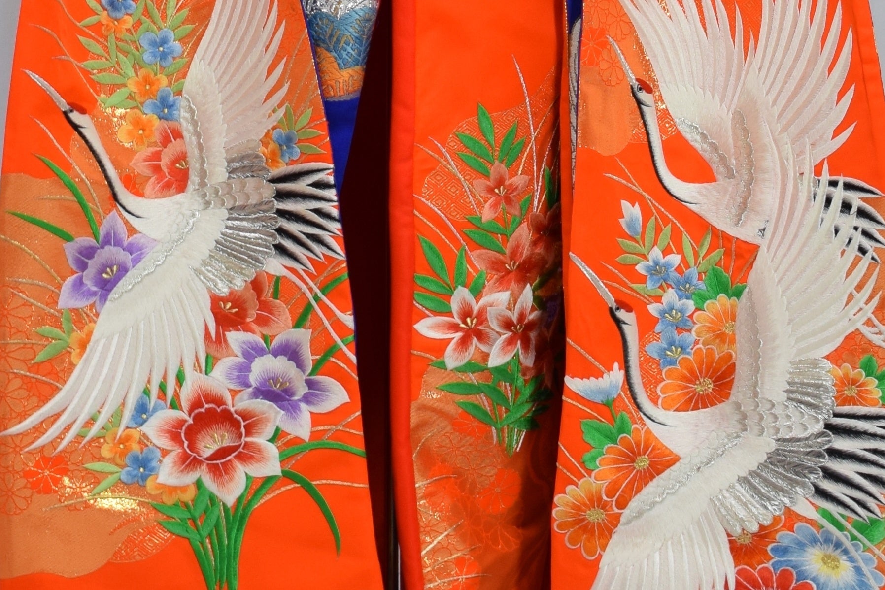 素材には一度使用された着物を使い、経年変化による風合いと、現代のテキスタイルにはない深みのある色彩を、大胆なパッチワークと繊細な職人技で構成しています。
