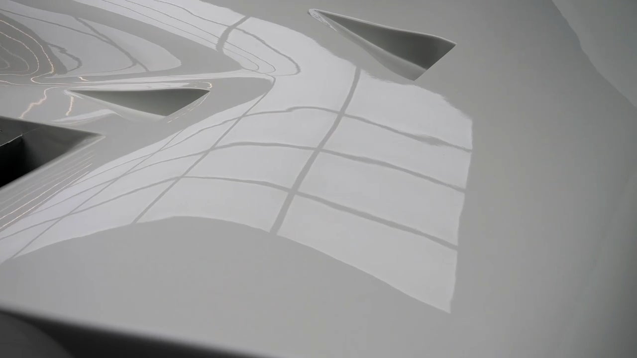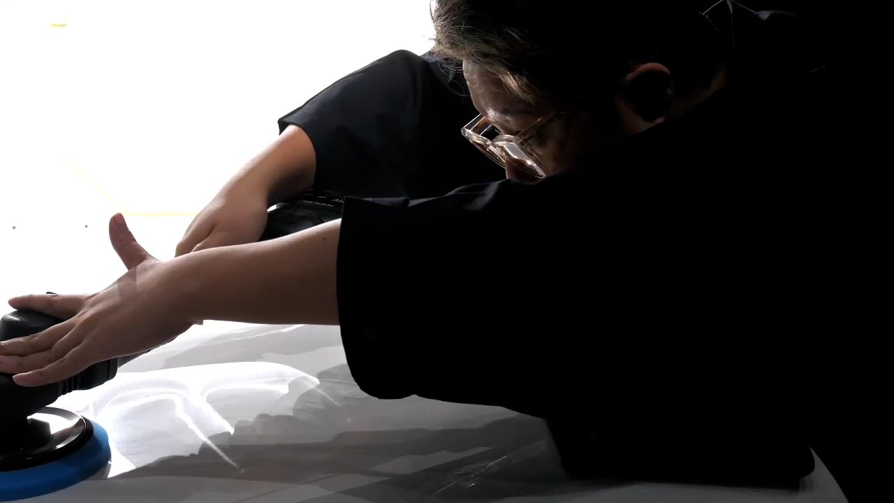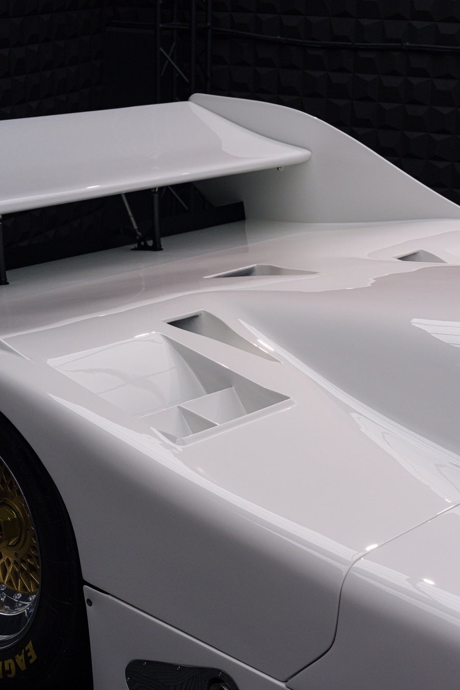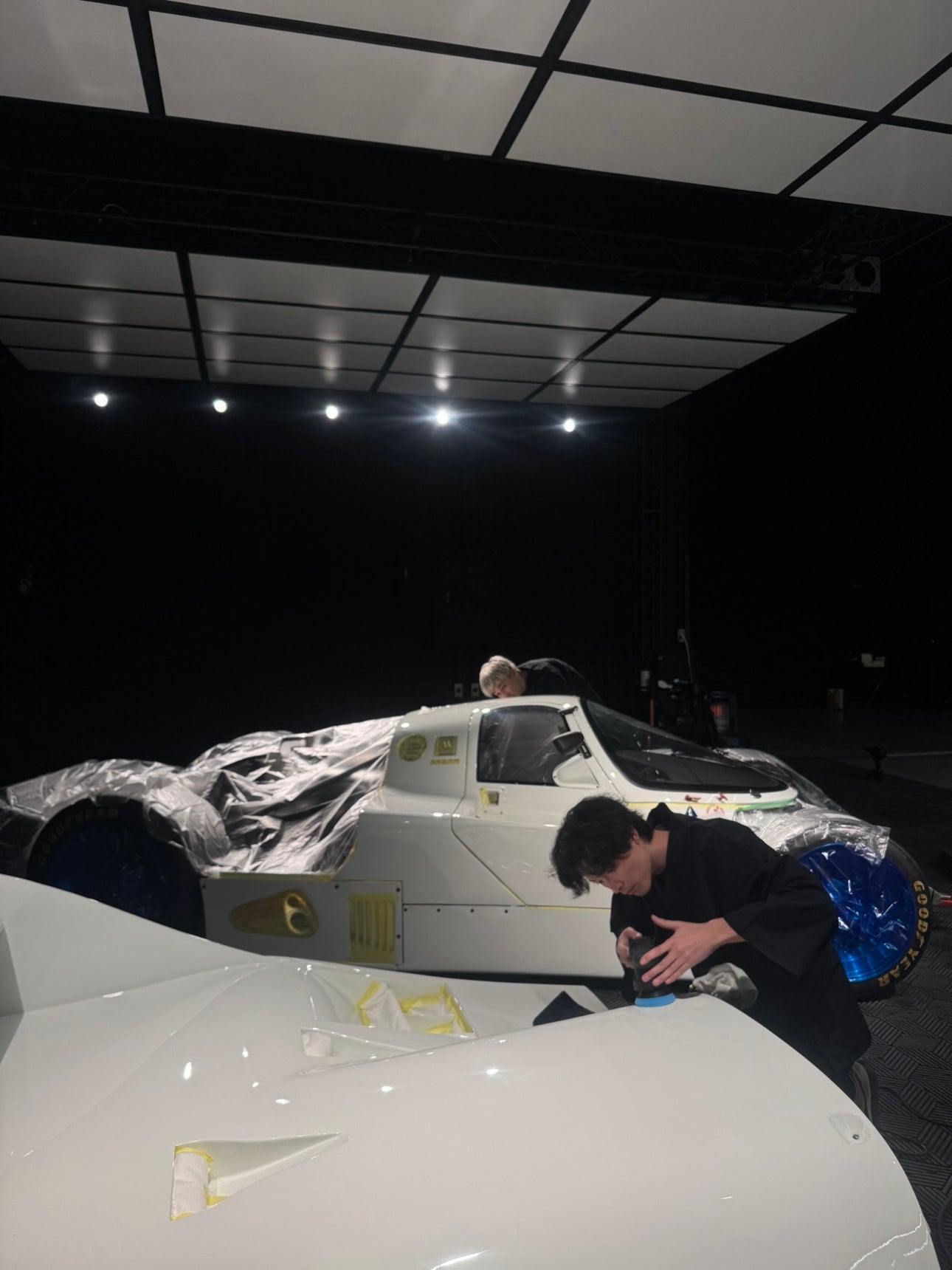今回フルレストアされ、新たに塗装されたポルシェ962Cに対し、我々はパネルごとのオレンジピール・塗装肌の改善を行いました。完璧な鏡面にするだけではなく、ボディラインを美しく見せるための緻密な肌調整を全面に渡り施しています。 最終研磨は、困難とされるシングルアクションでの水研ぎ工程を部分ごとに実施し、研磨技術のみで陰影を演出しました。