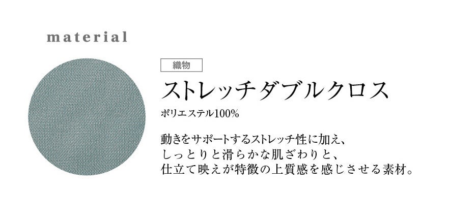 動きをサポートするストレッチ性に加え、しっとりと滑らかな肌触りと、仕立て映えが特徴の上質感を感じさせる素材。